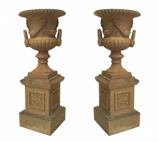 Outdoor Victorian style iron urn on base with handles (20th Cent.).