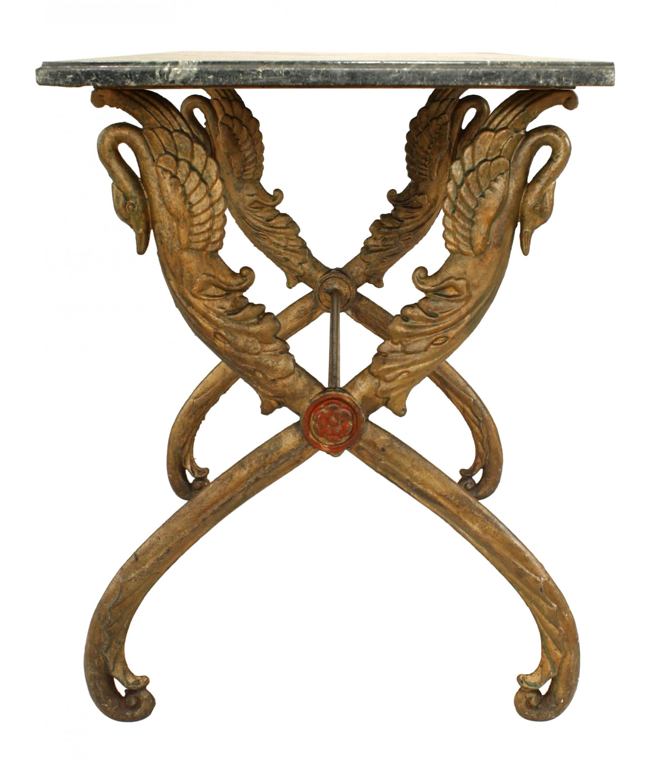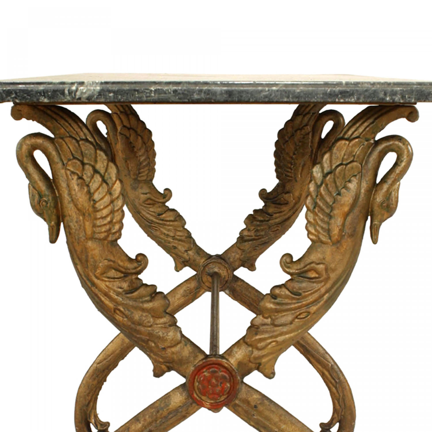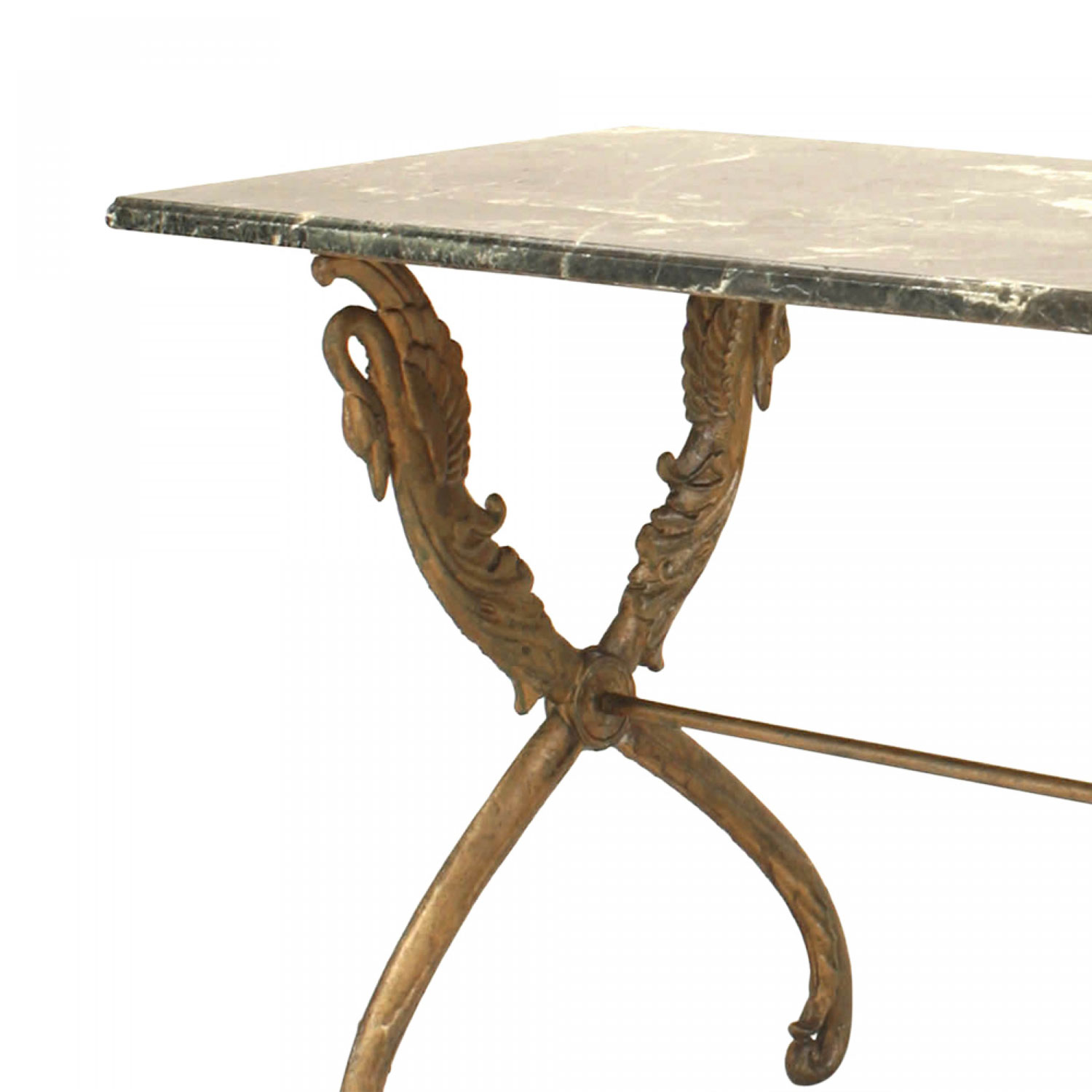 Outdoor Victorian (late 19th/20th Century) painted iron center table with rectangular black marble top on two X form swan headed legs..