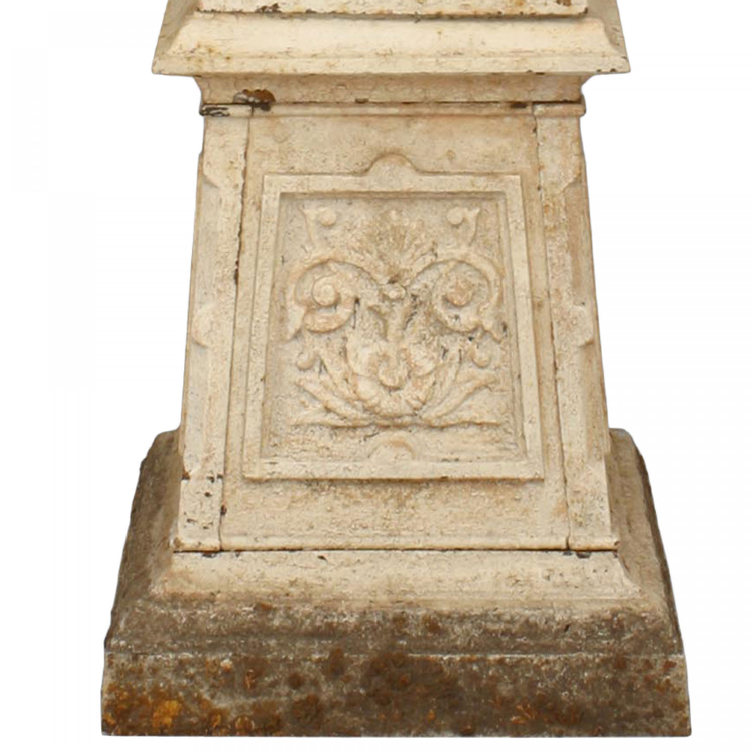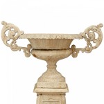 Outdoor American Victorian white painted round iron urn with large scroll handles and scalloped top set on a square base..