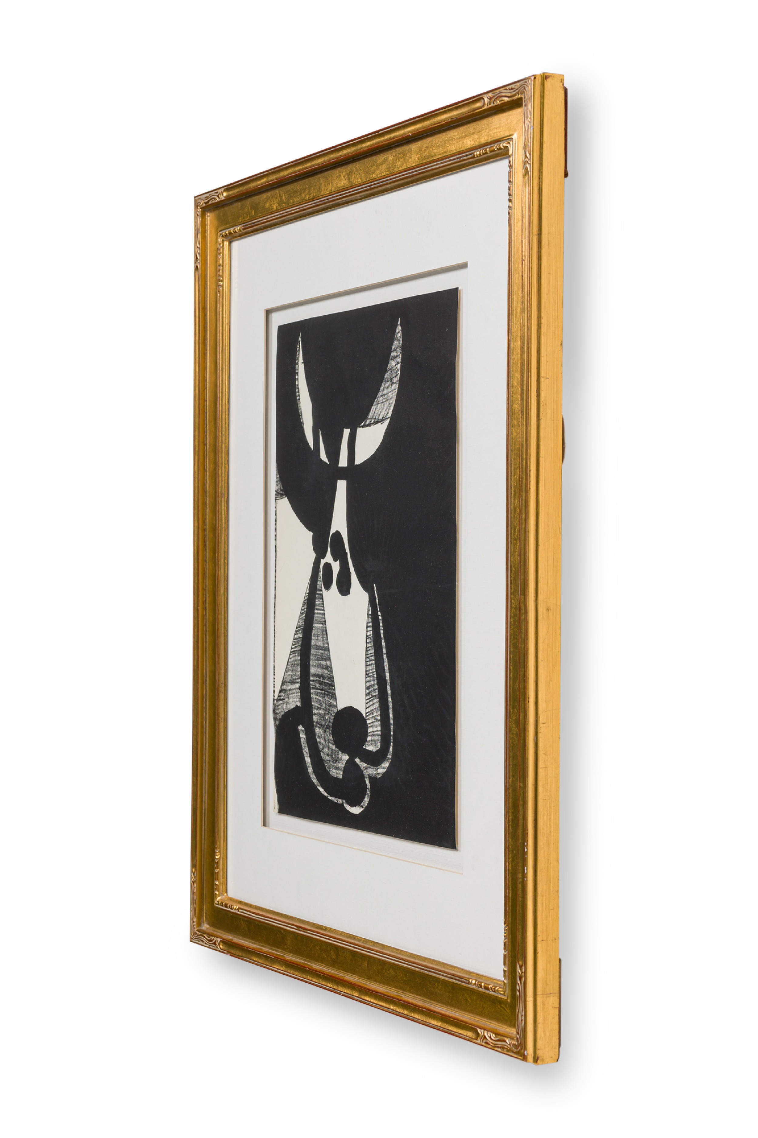 Spanish Mid-Century lithograph with the composition of an abstract ominous representation of a bull with a gray and black background in a gold frame (titled: Head of Bull Turned to Left) (Verso, Certificate of Authenticity: PABLO PICASSO)