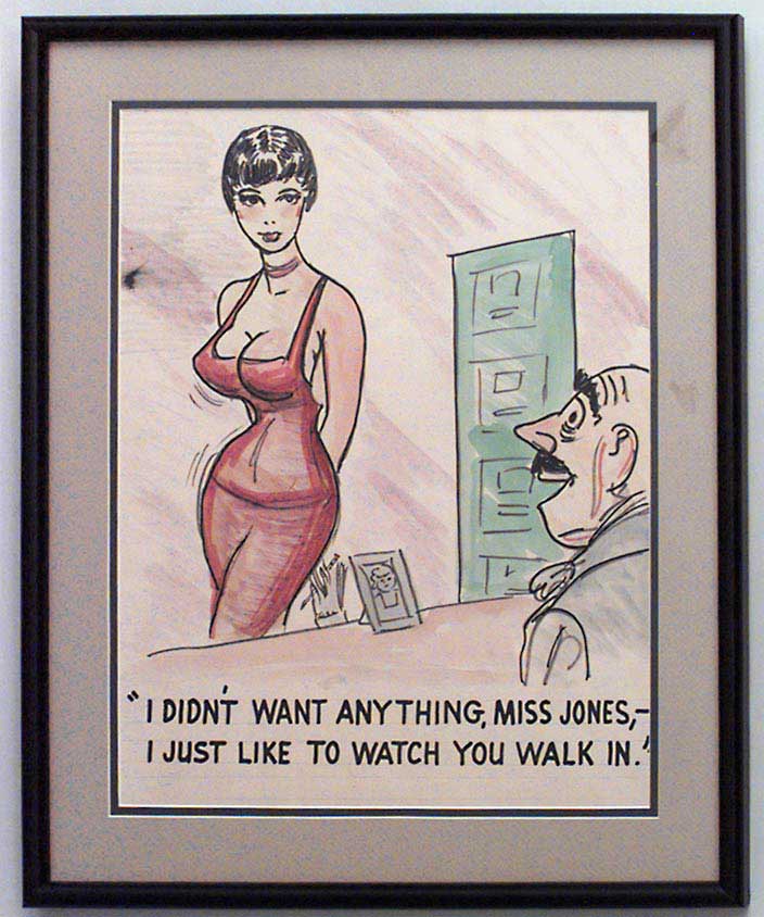 American Mid-Century (unsigned) black framed caricature watercolor of man talking to sexy secretary ("I didn't want anything, Miss Jones, I just like to watch you walk in")