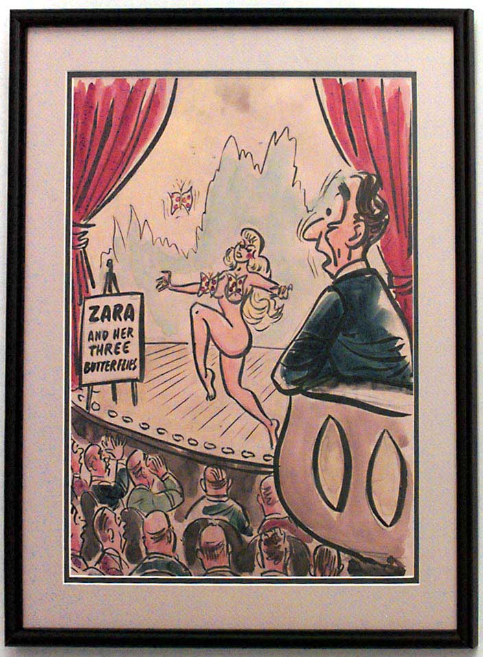 American Mid-Century (unsigned) black framed caricature watercolor of Zara with her 3 strategically placed butterflies dancing on stage.