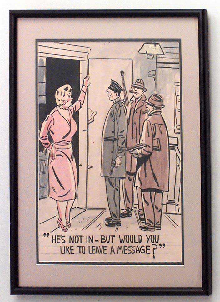 American Mid-Century (unsigned) black framed caricature watercolor of woman at door with police holding guns ("He's not in but would you like to leave a message?").