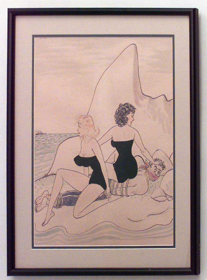 American Mid-Century (unsigned) black framed caricature watercolor of 2 women with man tied up on beach.