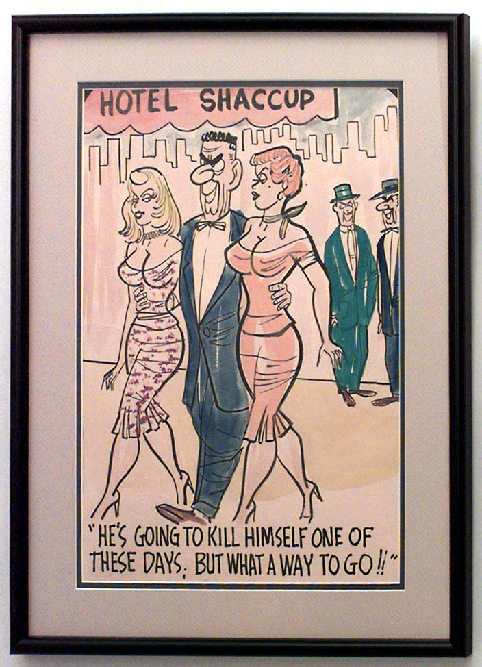 American Mid-Century (unsigned) black framed caricature watercolor of man walking with 2 women ("He's going to kill himself one of these days. But what a way to go").