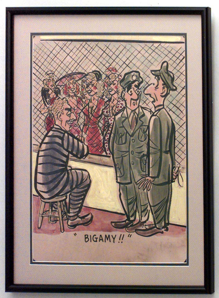 American Mid-Century (unsigned) black framed caricature watercolor of prisoner being visited by 4 women with guards looking on ("Bigamy!").