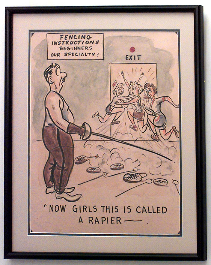 American Mid-Century (unsigned) black framed caricature watercolor of man with sword giving fencing lessons to women ("Now girls, this is called a rapier!").
