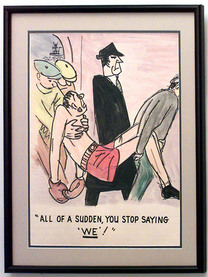 American Mid-Century (unsigned) black framed caricature watercolor of boxer carried out next to man in suit ("All of a sudden you stop saying WE").