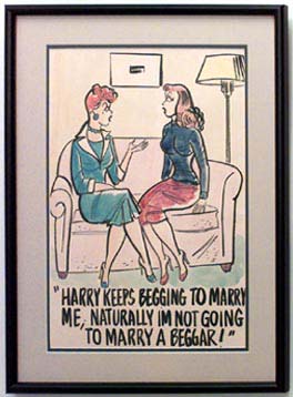 American Mid-Century (unsigned) black framed caricature watercolor of 2 girls chatting ("Harry keeps begging to marry me; naturally I'm not going to marry a beggar!").