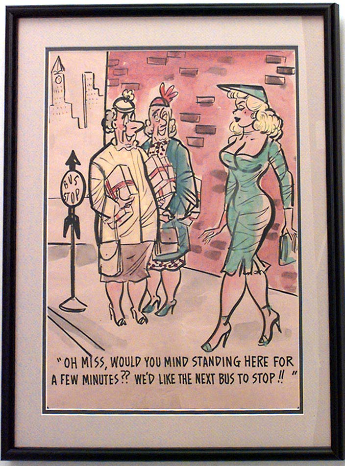 American Mid-Century (unsigned) black framed caricature watercolor of 2 old ladies with sexy girl ("Miss, would you stand here for a few minutes? We'd like the next bus to stop").