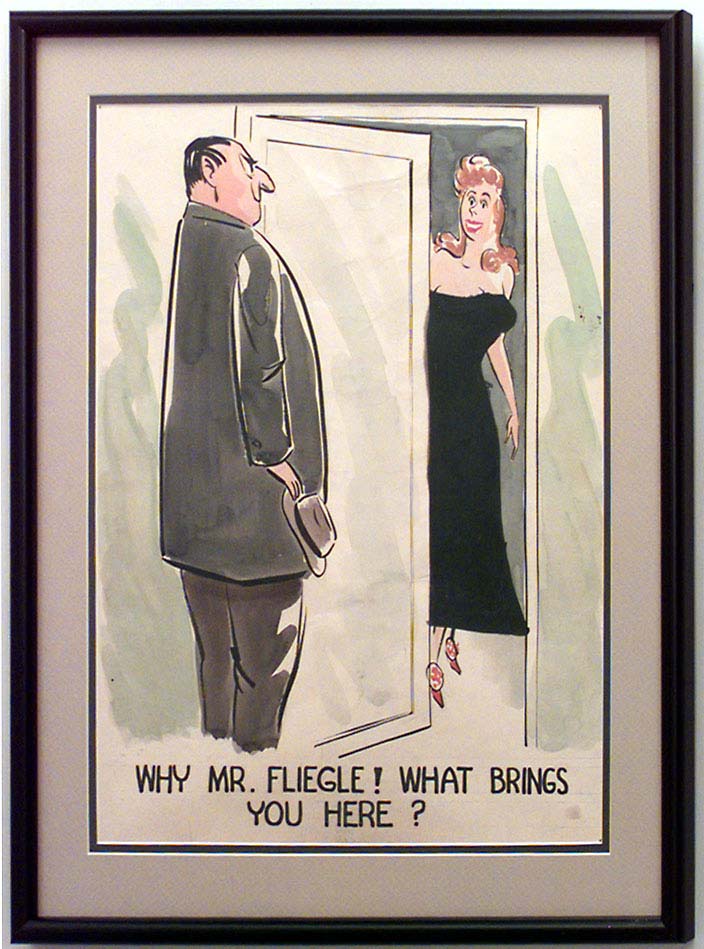 American Mid-Century (unsigned) black framed caricature watercolor of woman answering door ("Why Mr. Flegle! What brings you here?").