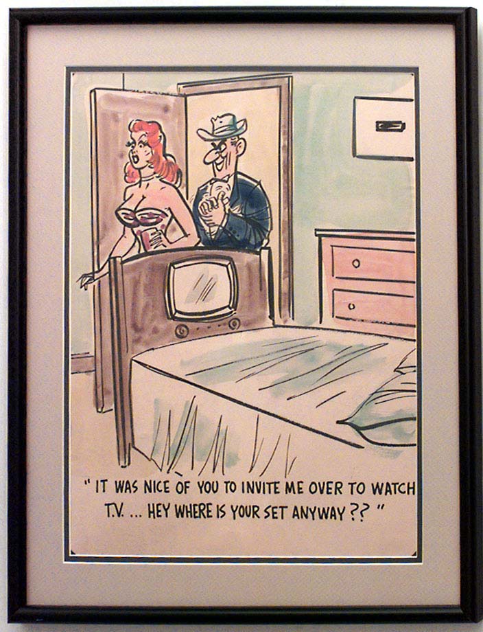 American Mid-Century (unsigned) black framed caricature watercolor of couple in bedroom ("It was nice of you to invite me over to watch TV - Hey where is your set anyway?")