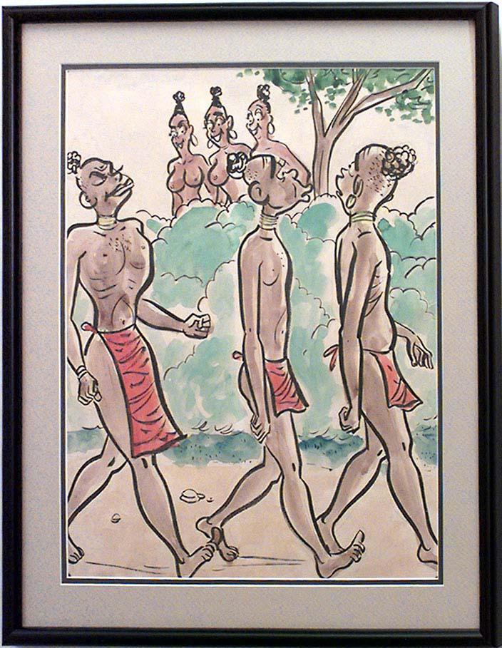 American Mid-Century (unsigned) black framed caricature watercolor of 3 African men walking by 3 African naked women.