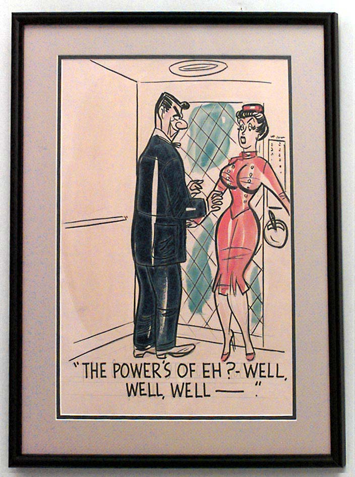 American Mid-Century (unsigned) black framed caricature watercolor of female elevator operator with groping man ("The powers of eh? Well, well, well").