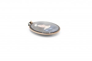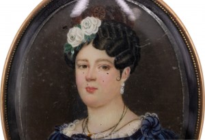 French Victorian miniature watercolor on paper portrait of lady with blue dress and white flowers in copper oval case