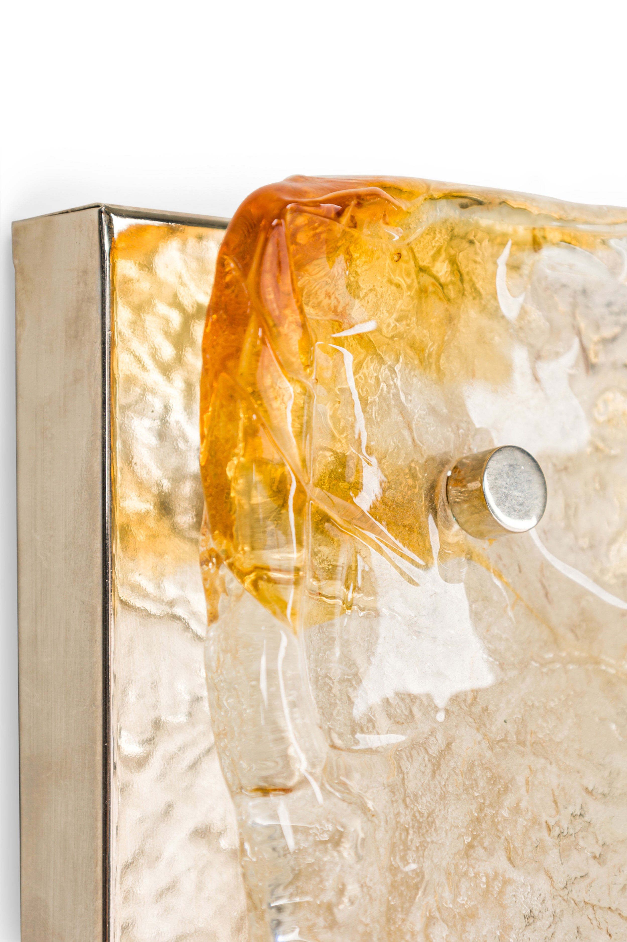 PAIR of Contemporary (possibly Scandinavian) large textured clear and amber glass sconces with a square freeform design (PRICED AS PAIR).
