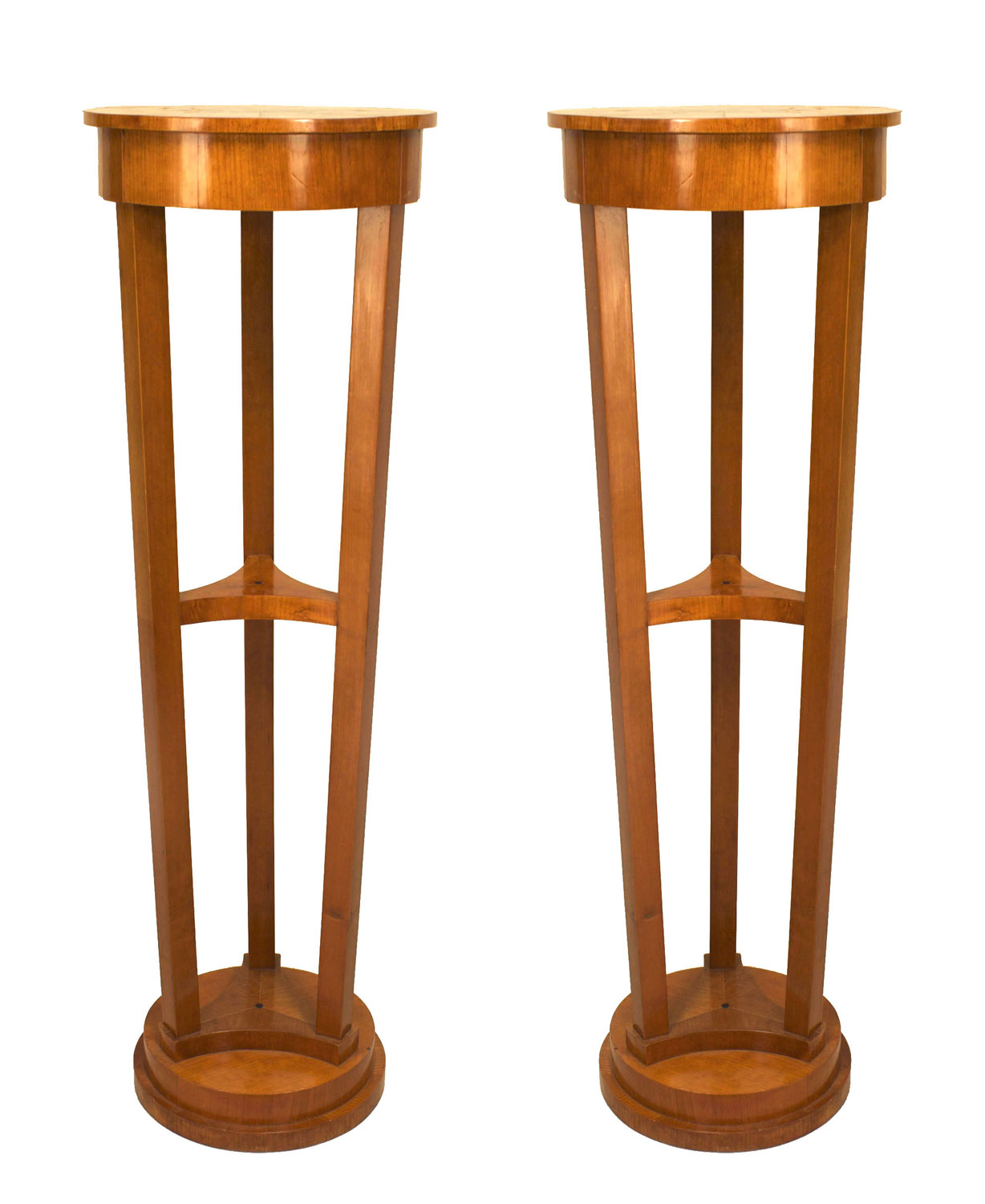 PAIR of Austrian Biedermeier style (19th Cent) maple pedestals having a round inlaid sunburst design top and stepped up base supported by 3 tapered columns connected with a lower & middle stretcher..