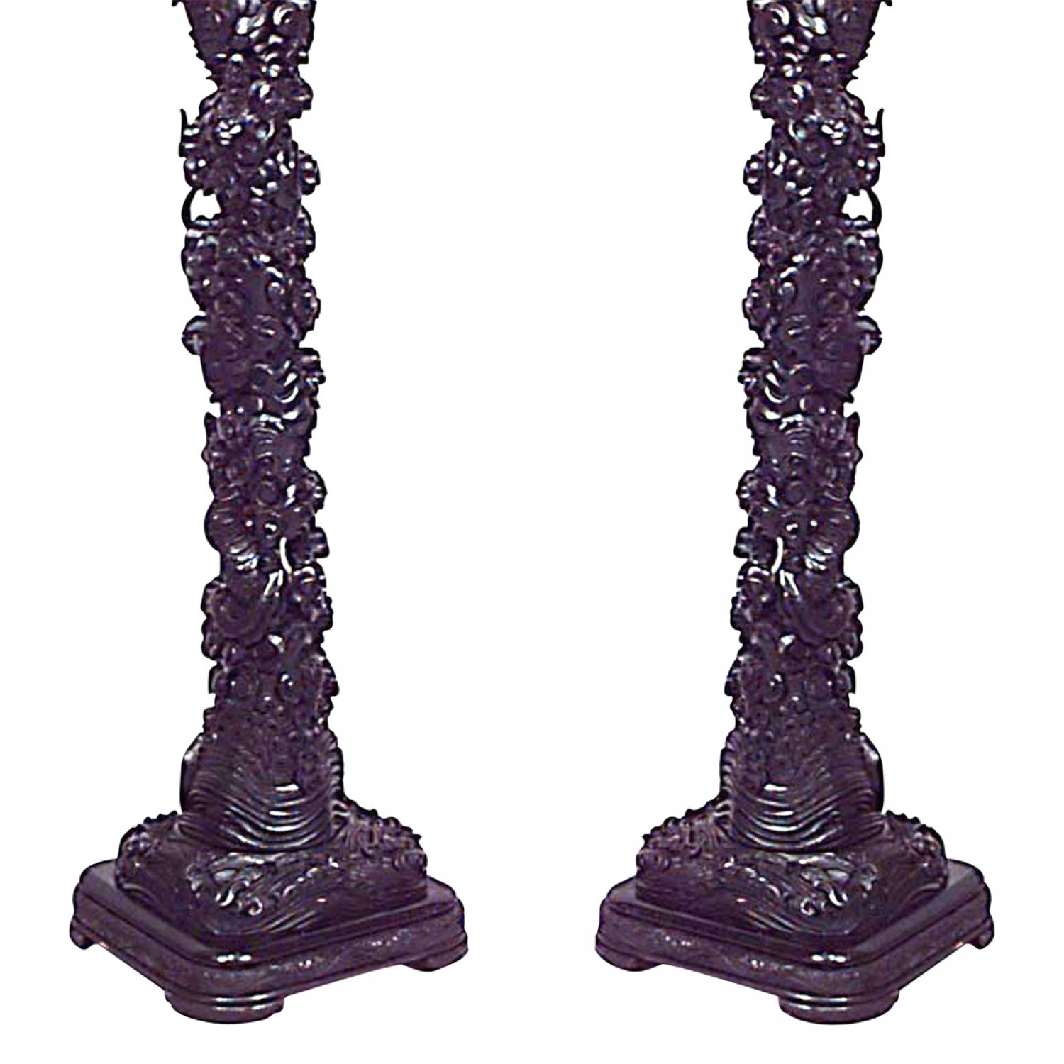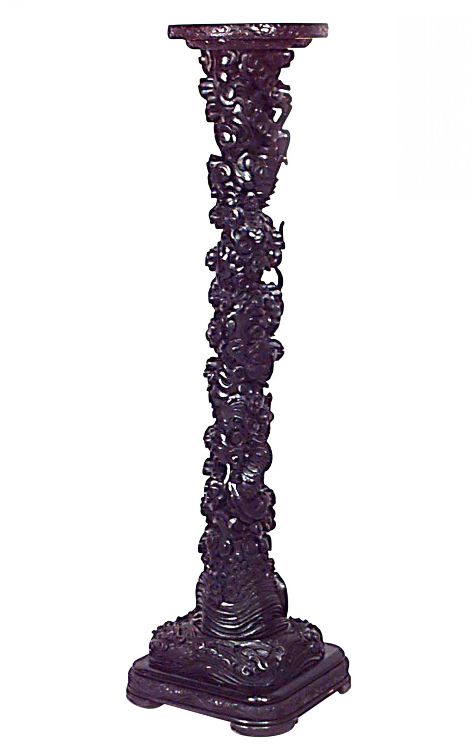 PAIR of Asian Chinese style (19th Cent) ebonized carved scroll design pedestals with square base and round top.
