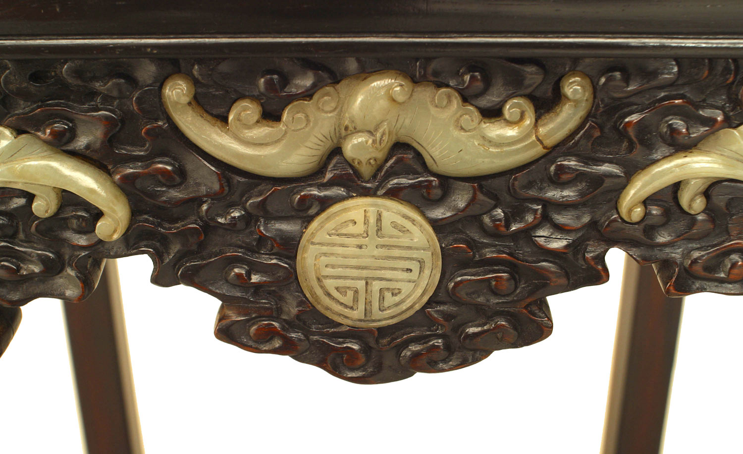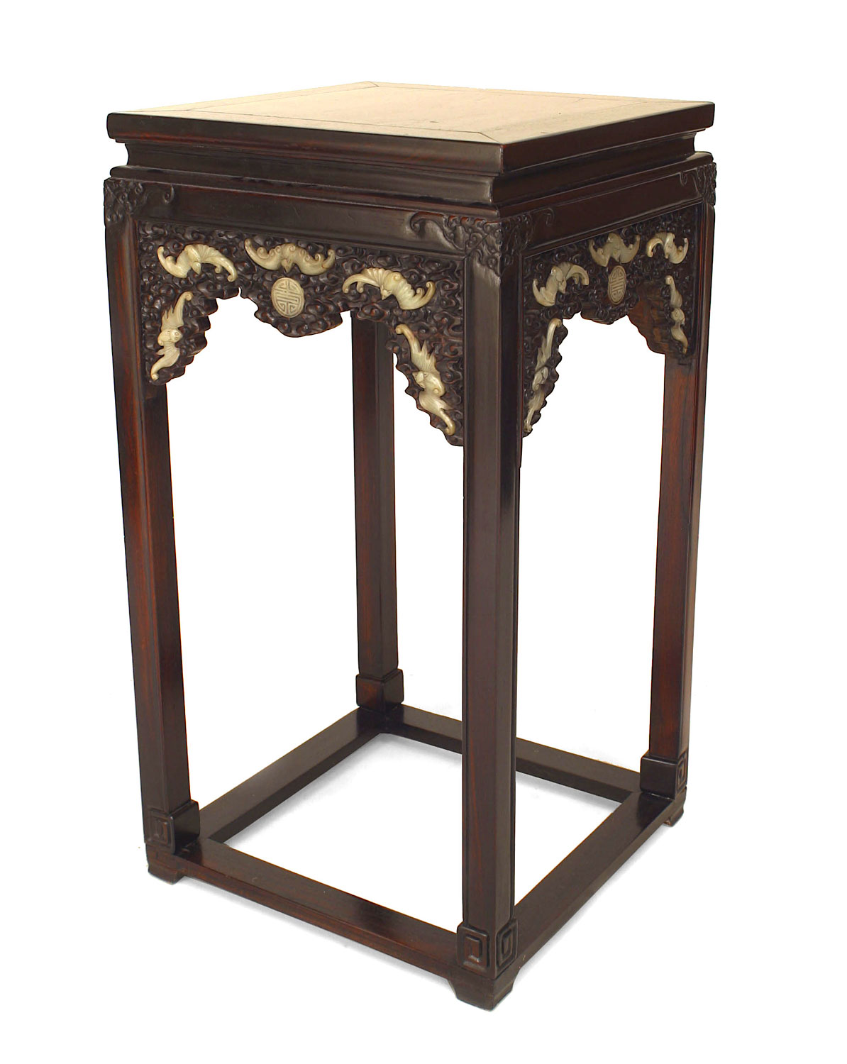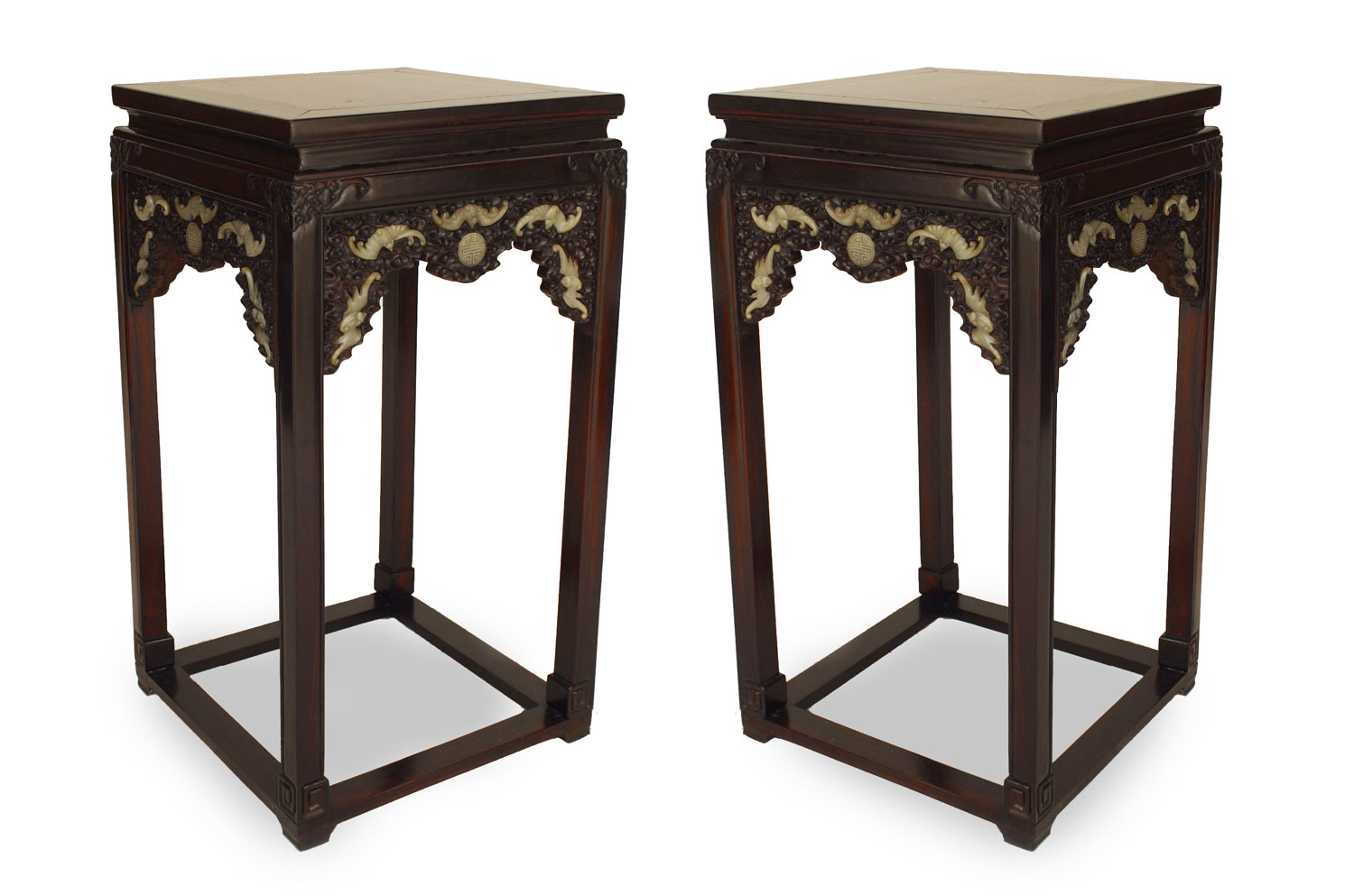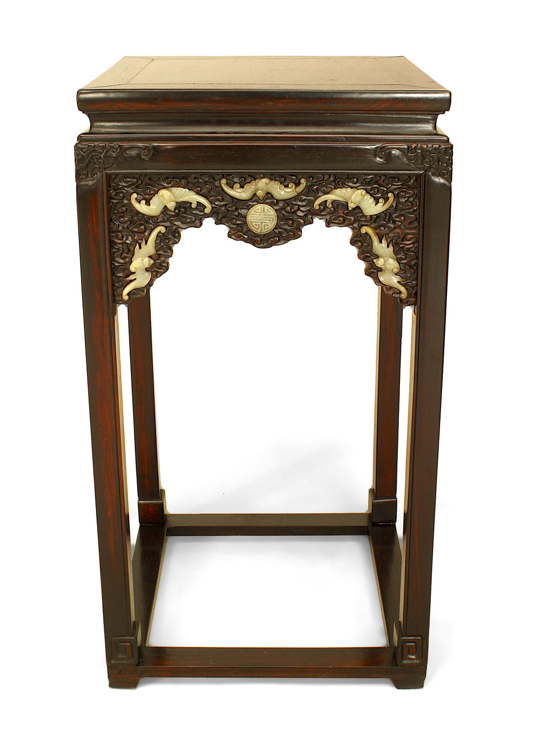 PAIR of Asian Chinese (18/19th Cent) hardwood pedestal stands with celadon jade bats inserted into a carved apron under top with a box form stretcher. (PRICED AS PAIR).