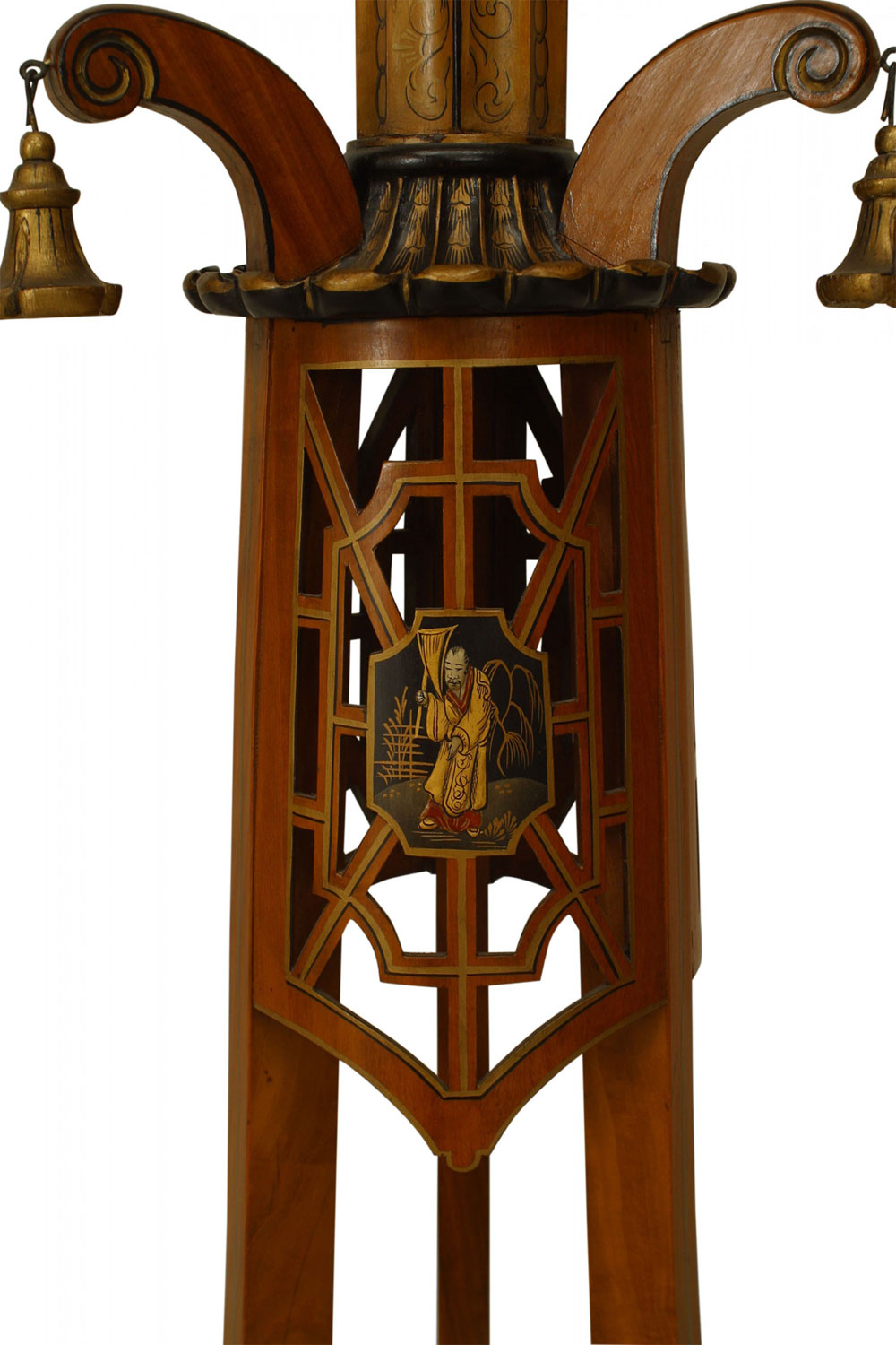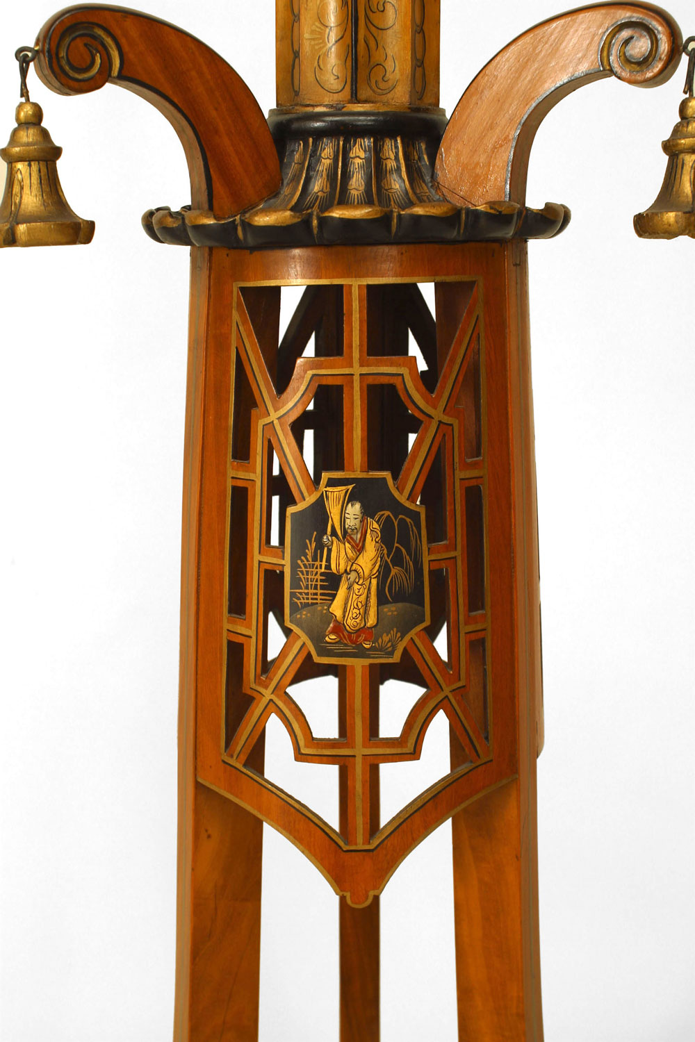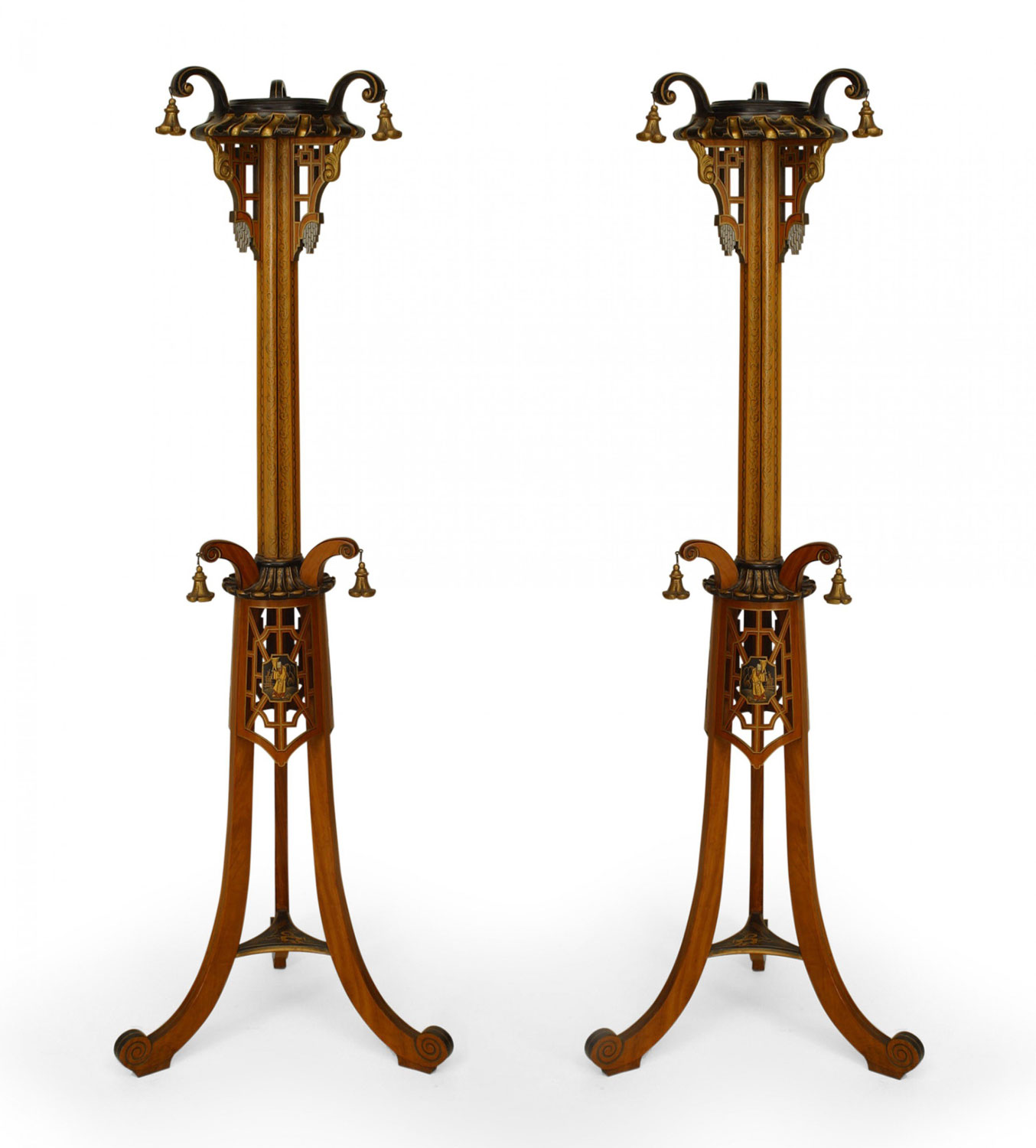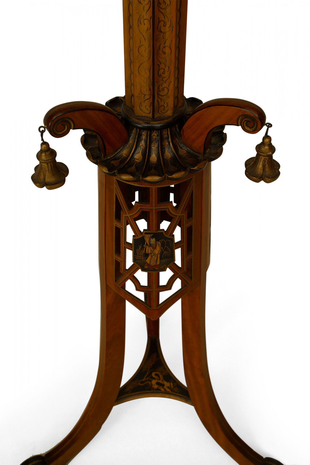 PAIR of English Chinese Chippendale style parcel black & gilt lacquered satinwood pedestals with tassels & fretwork. (attr: S. Hille & Co., early 20th Cent)