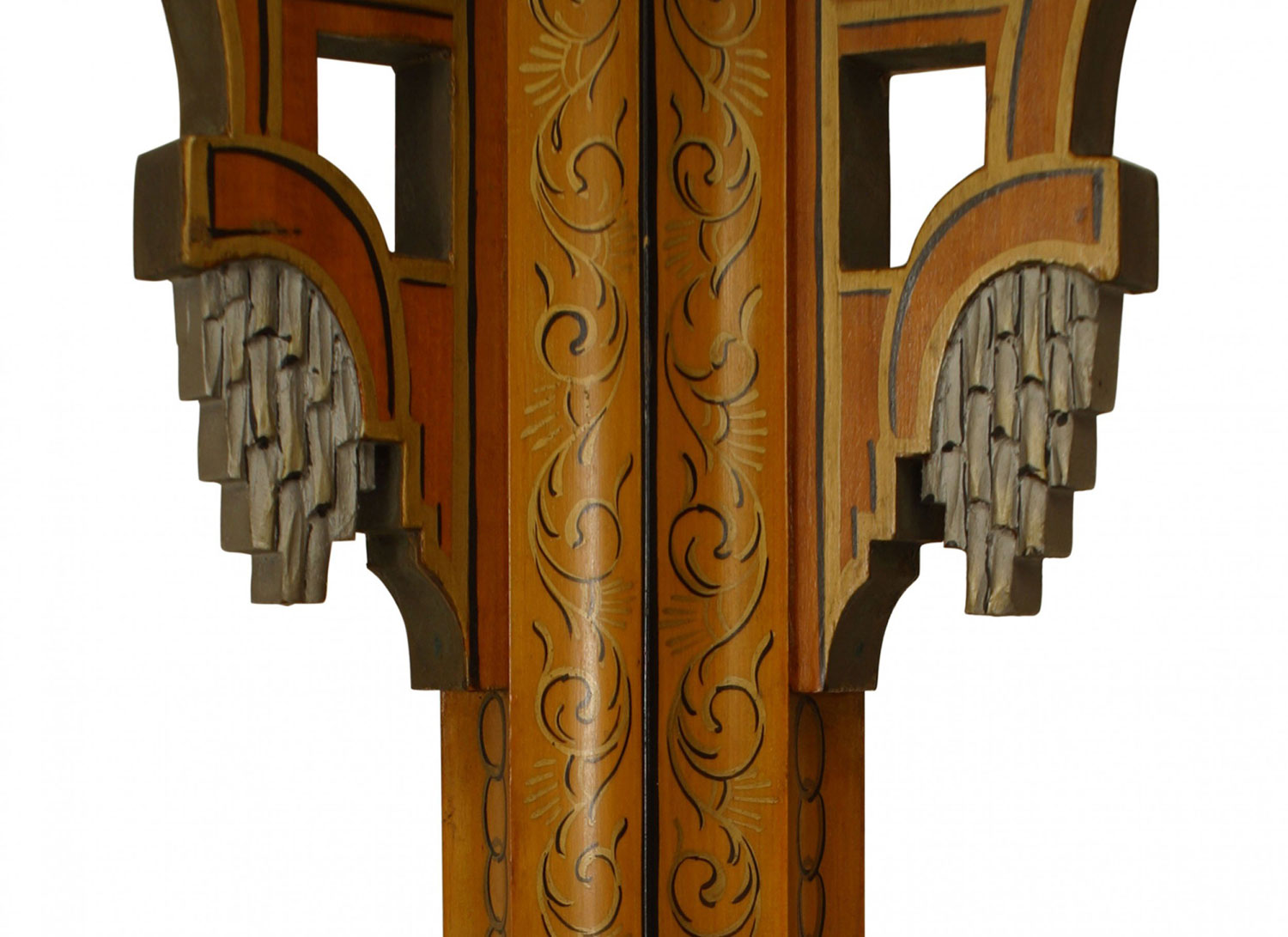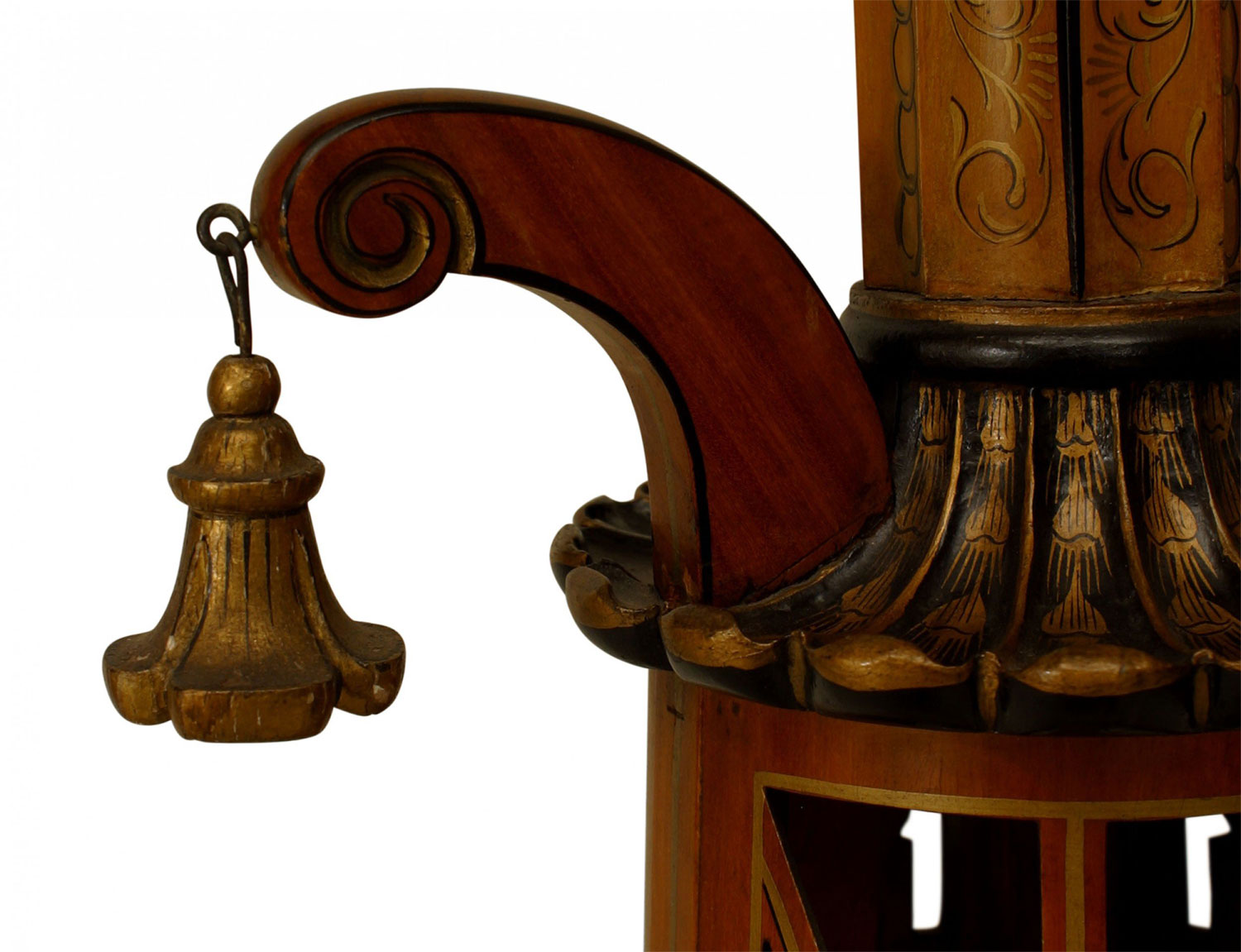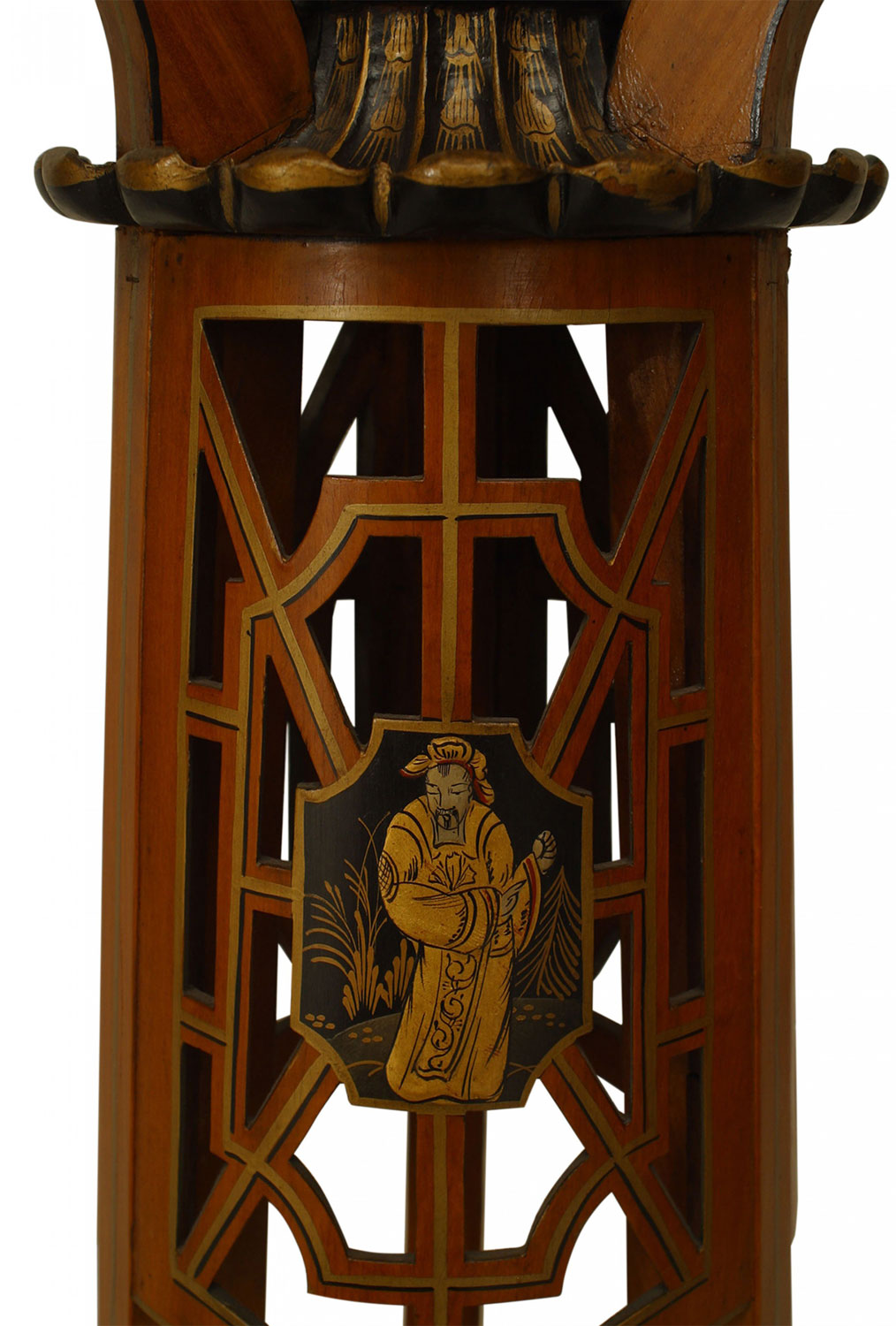PAIR of English Chinese Chippendale style parcel black & gilt lacquered satinwood pedestals with tassels & fretwork. (attr: S. Hille & Co., early 20th Cent).