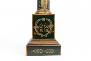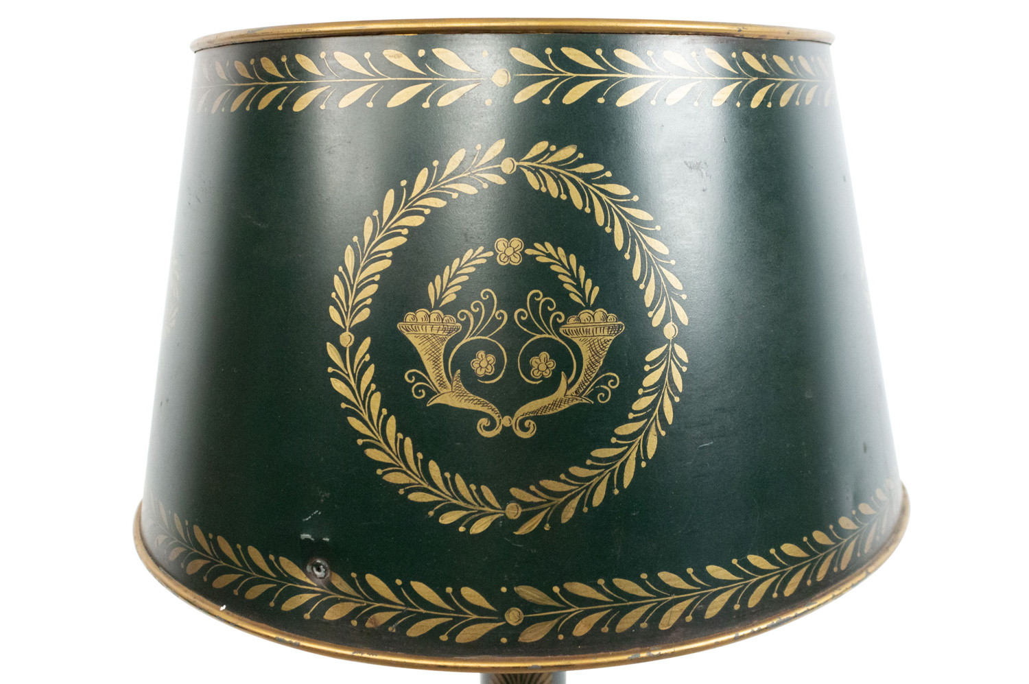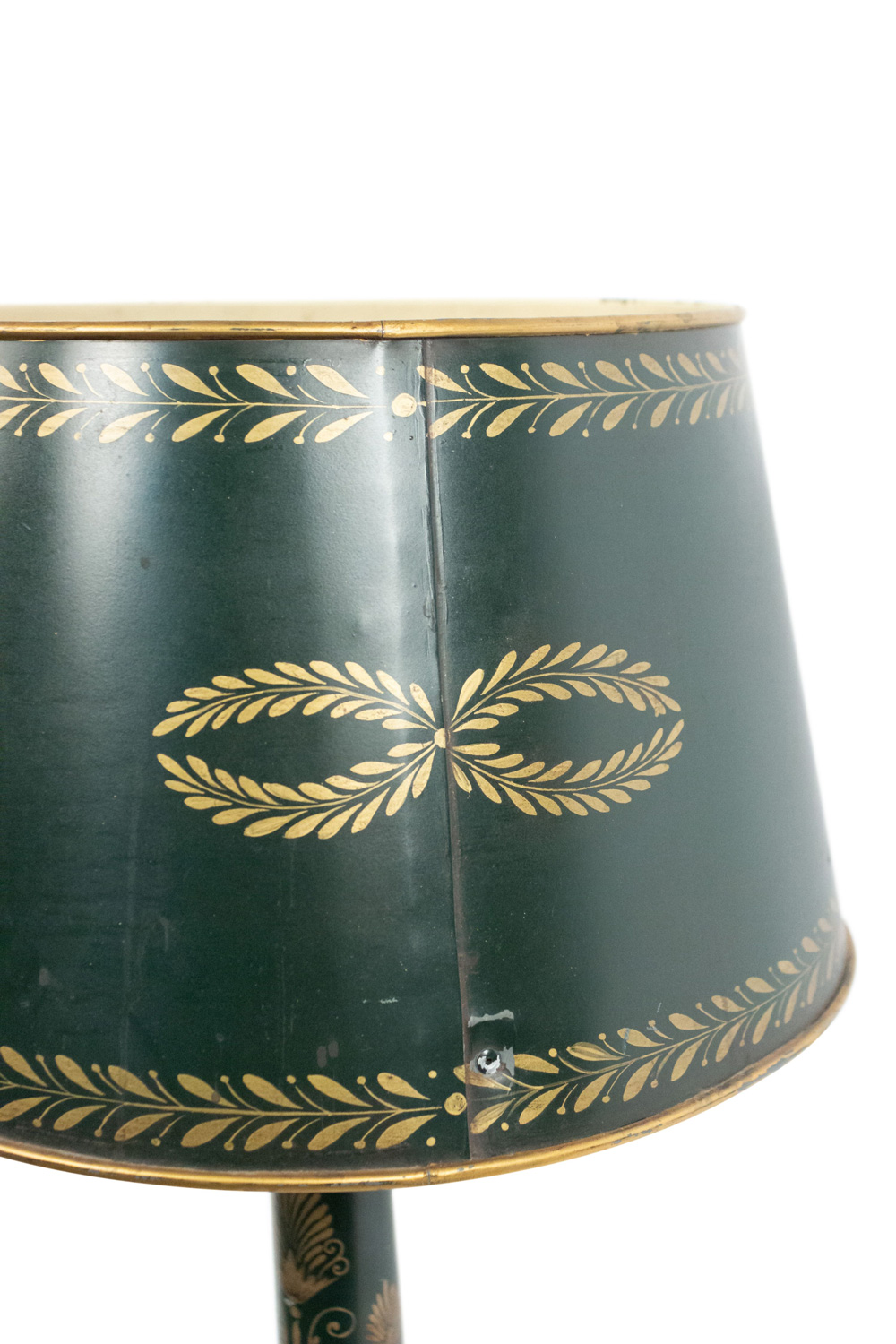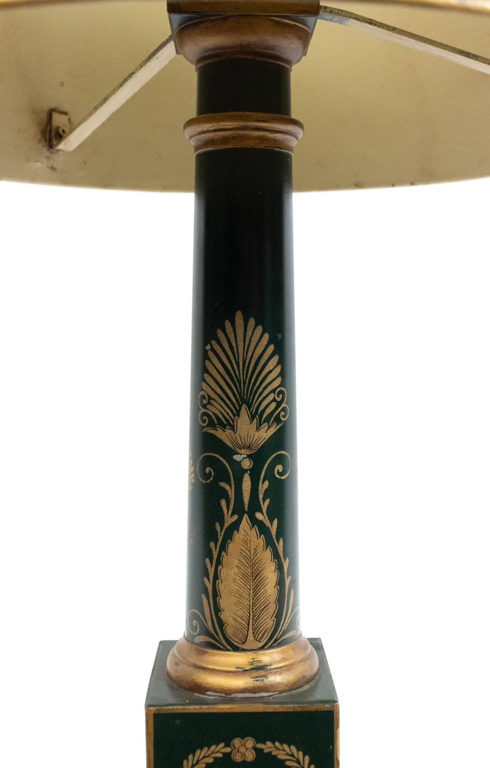 PAIR of French Directoire-style (20th Century) green tole and gilt decorated column table lamps with decorated shade