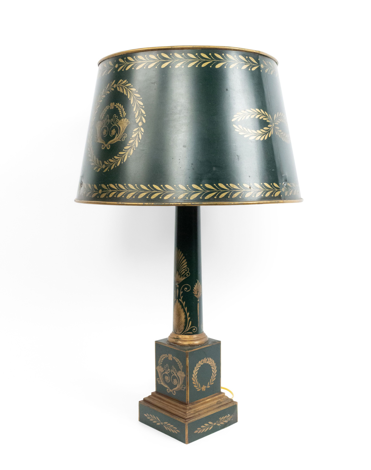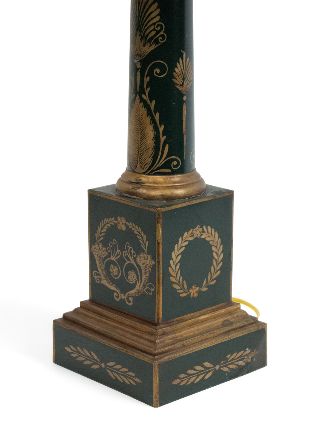 PAIR of French Directoire-style (20th Century) green tole and gilt decorated column table lamps with decorated shade.