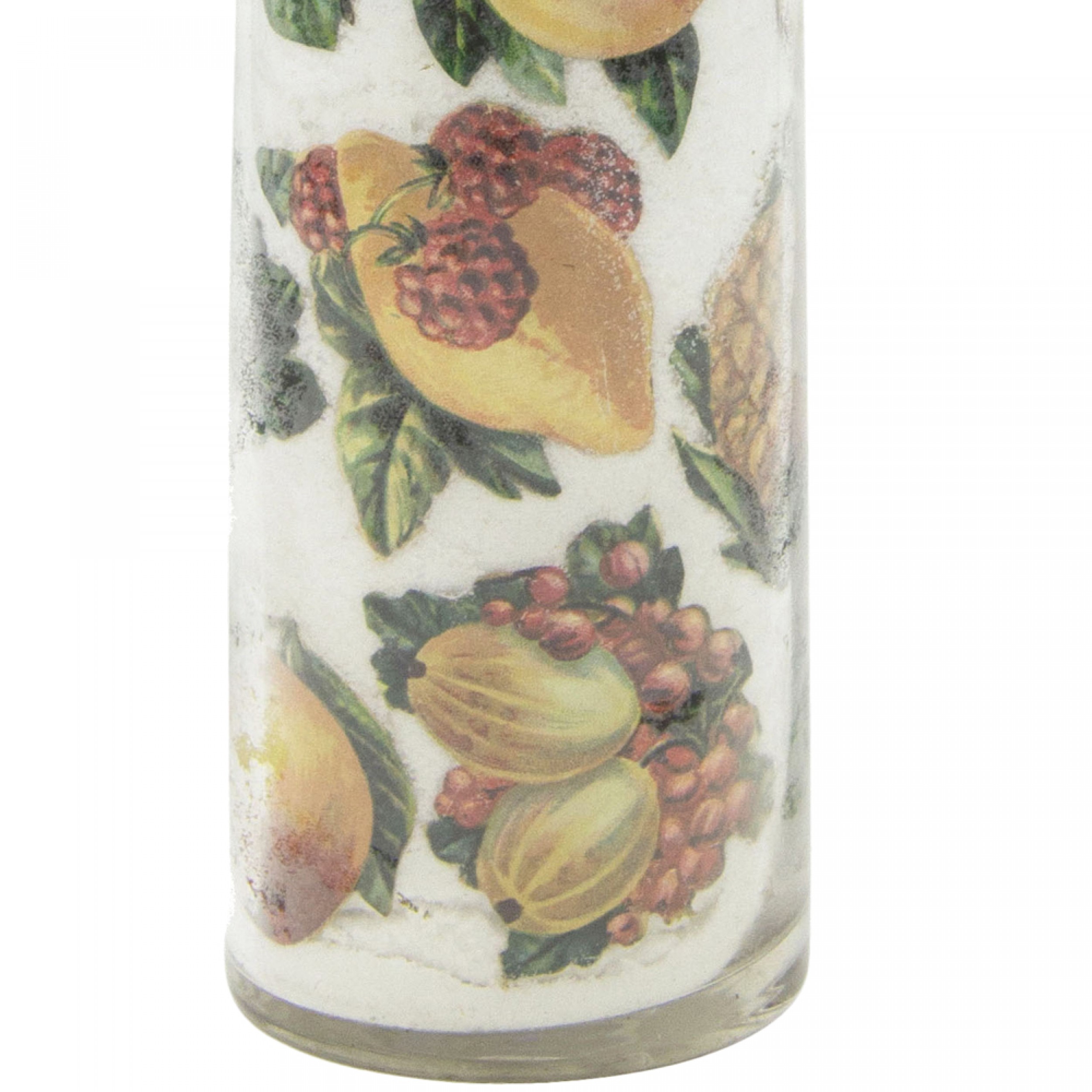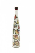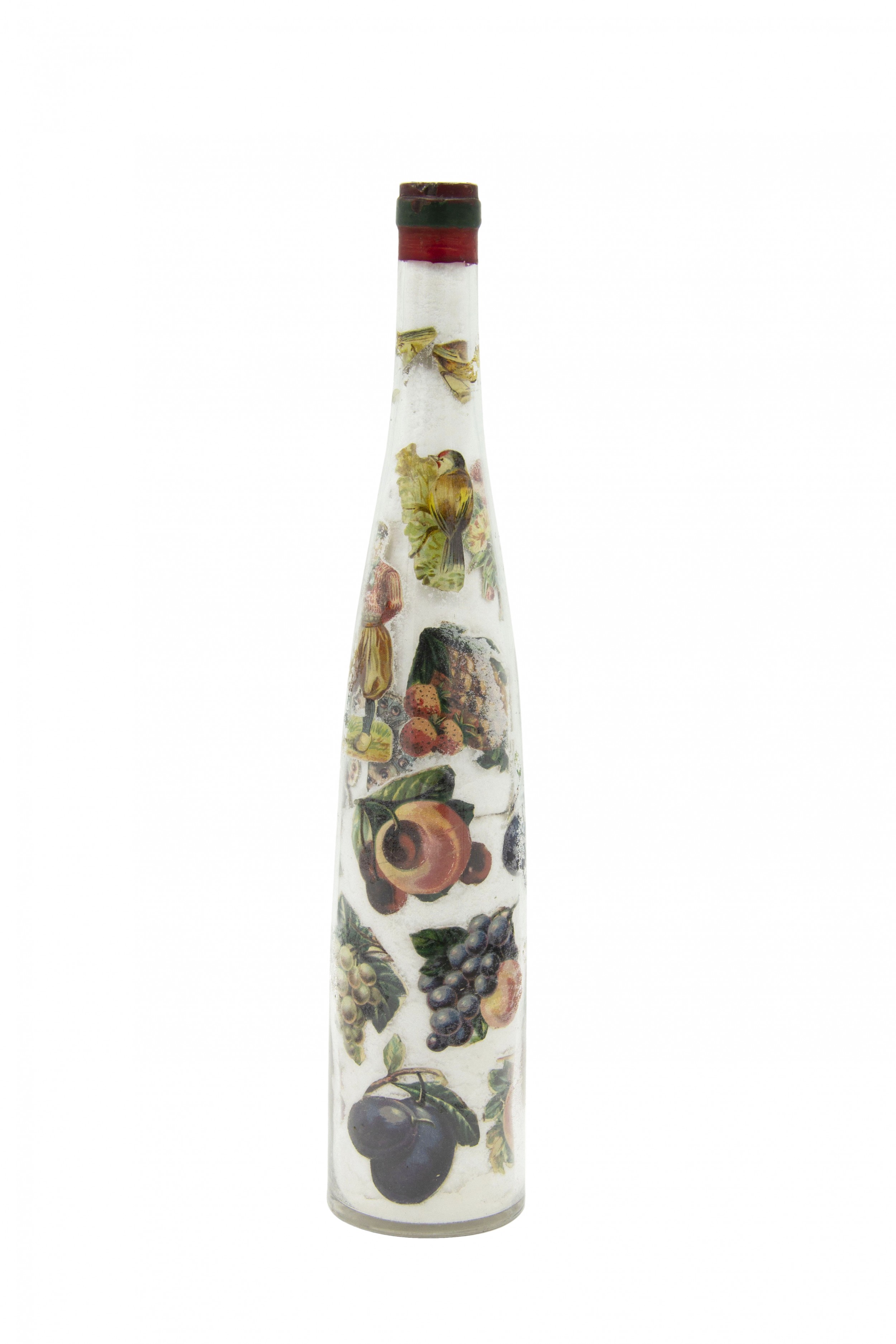 PAIR of French Victorian glass wine bottles with decoupage decoration filled with white sand (PRICED AS PAIR)