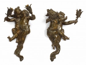 PAIR of French Victorian bronze (with green patina) cherub-shaped wall sconces with two flower-shaped arms. (signed JOSEPH CHERET)(PRICED AS PAIR)