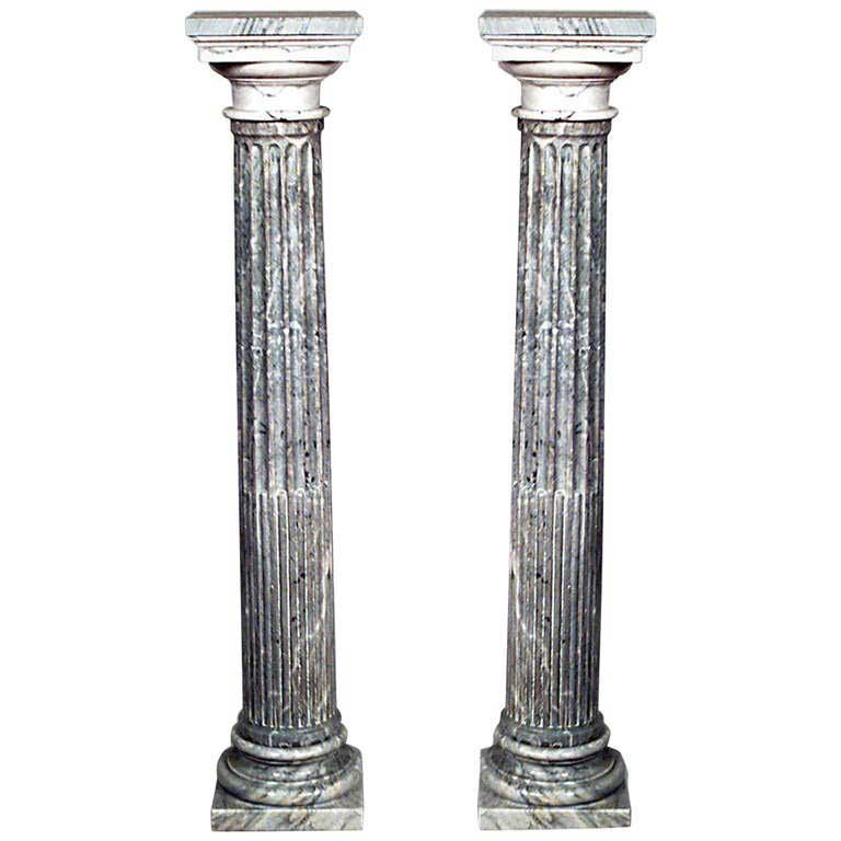 PAIR of French Louis XVI style (19/20th Cent) grey marble fluted column pedestals with square top..