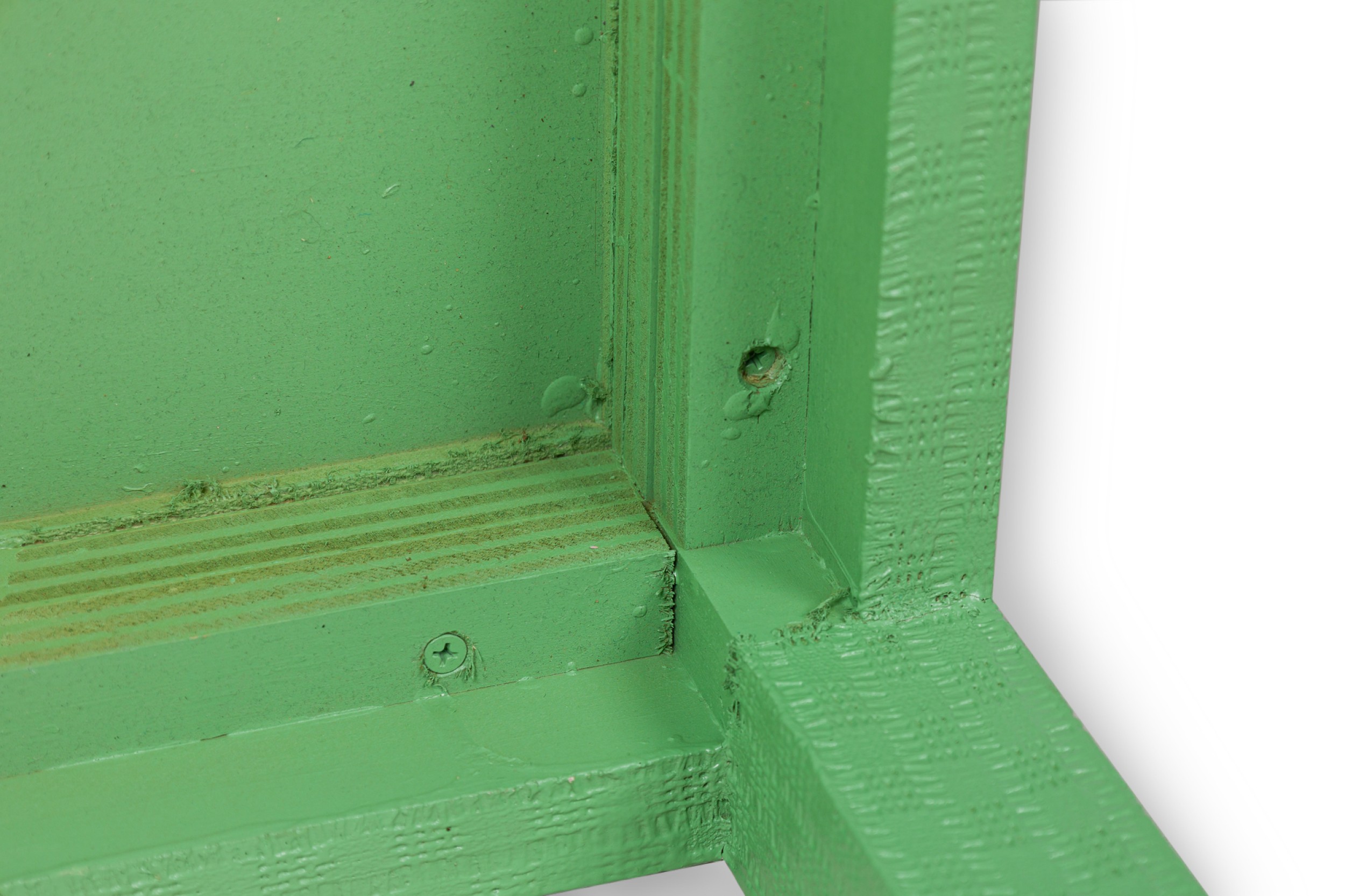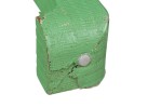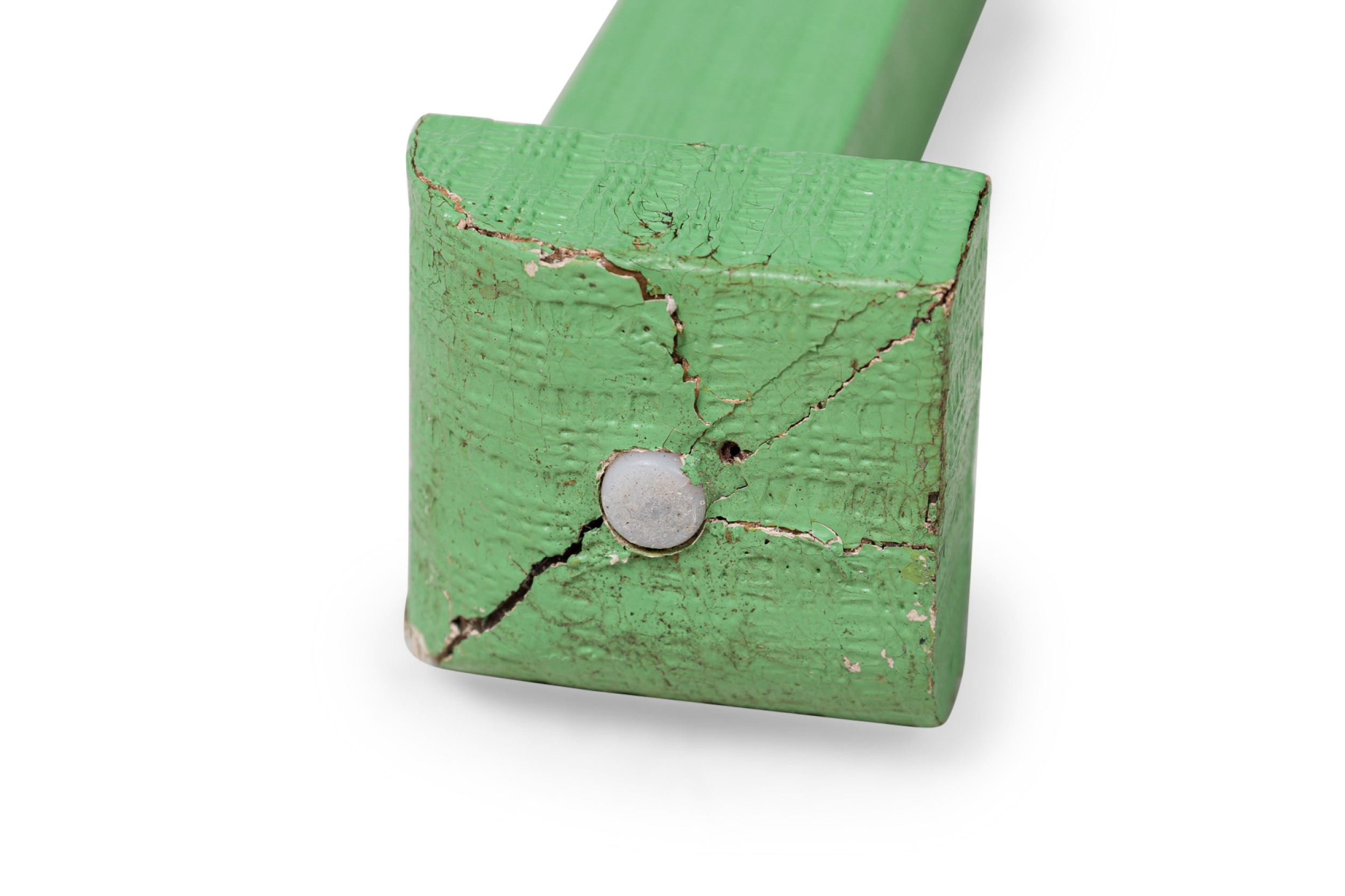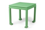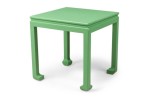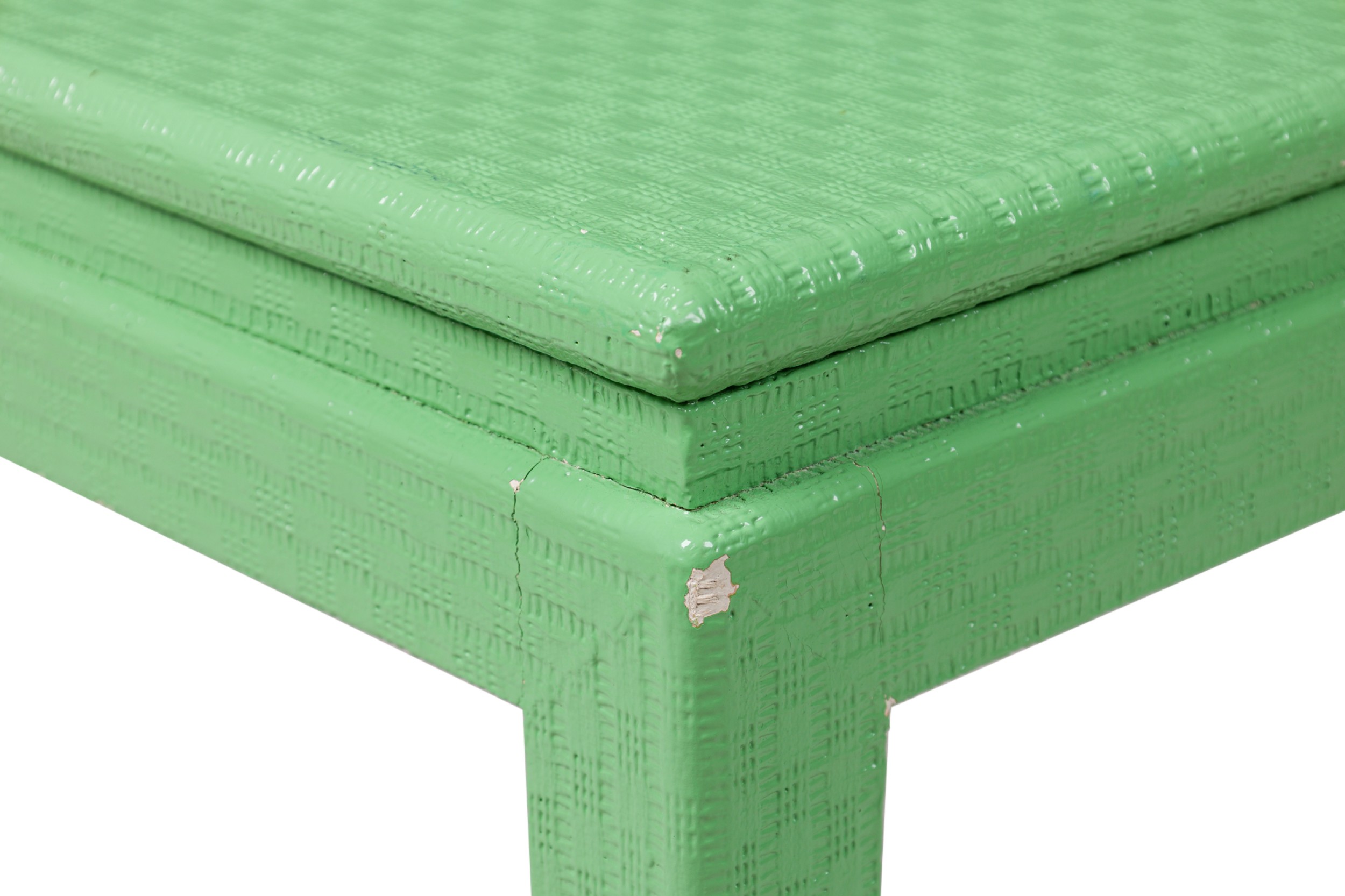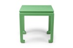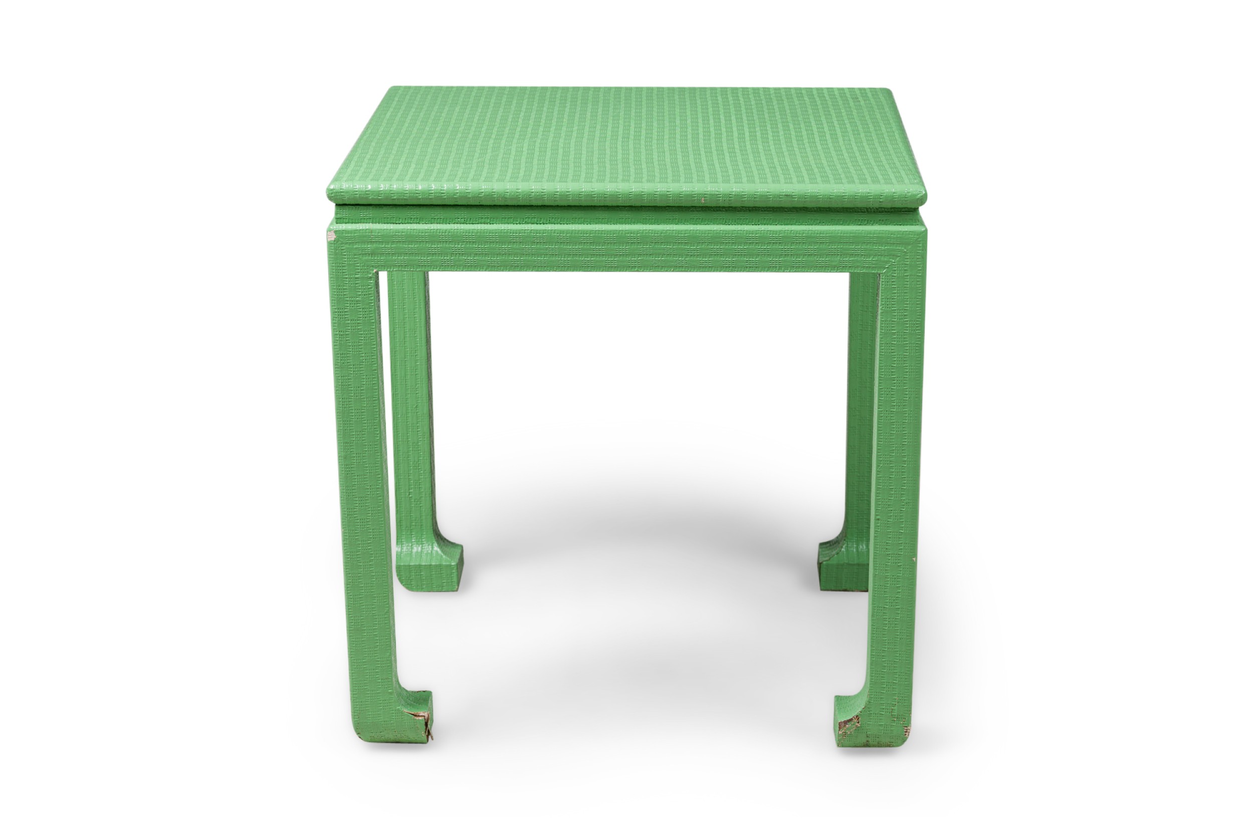PAIR of American Mid-Century square green painted canvas cloth end / side tables with an Asian influenced design having a shaped bottom to the apron and legs (KARL SPRINGER) (PRICED AS PAIR)