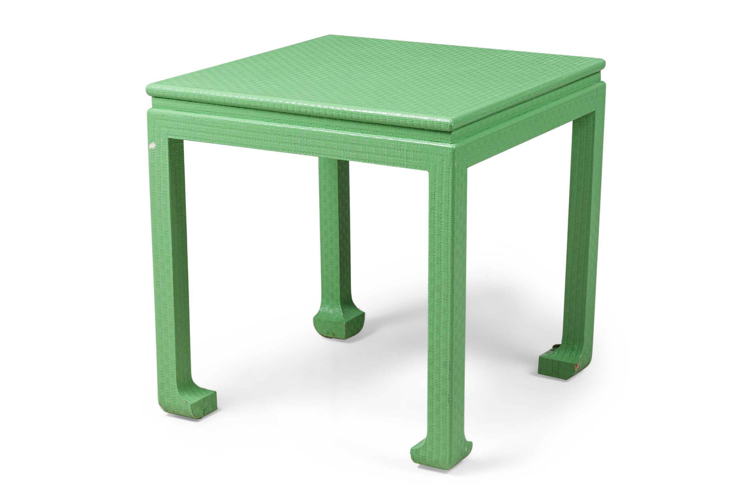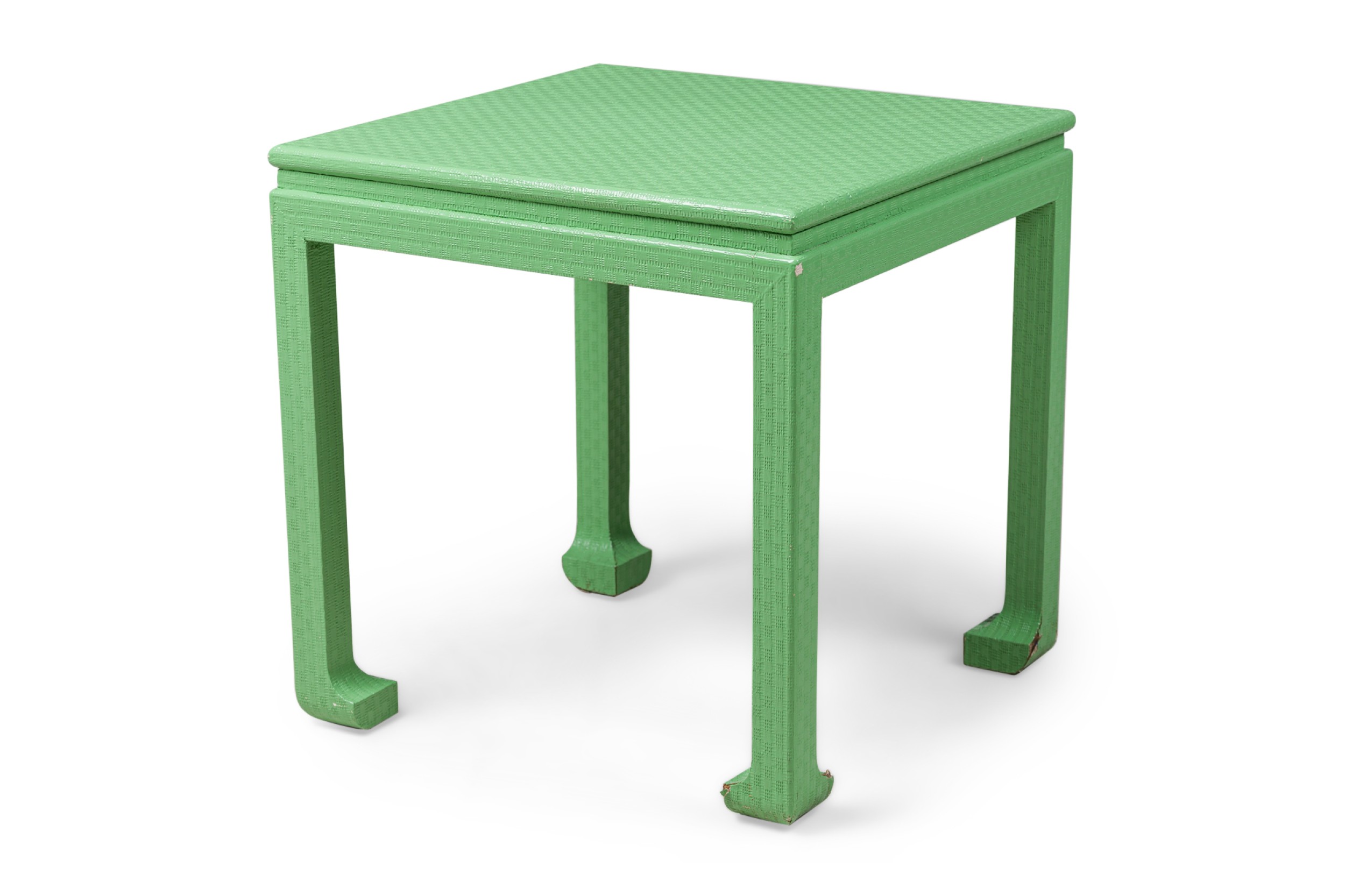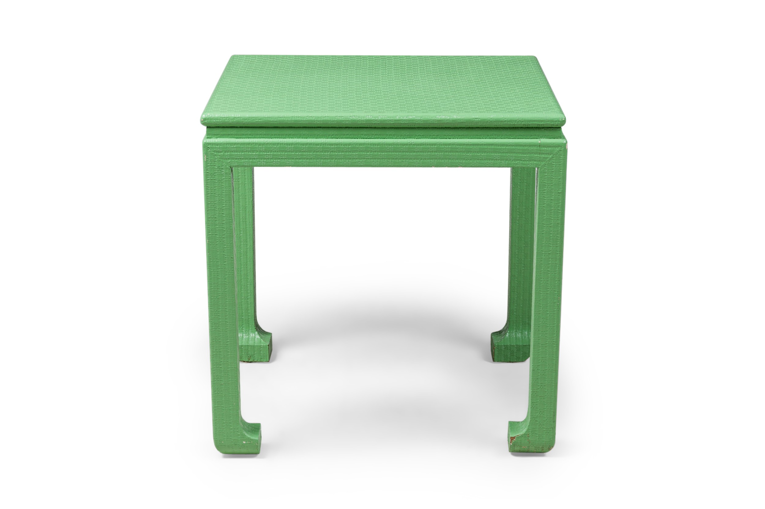 PAIR of American Mid-Century square green painted canvas cloth end / side tables with an Asian influenced design having a shaped bottom to the apron and legs (KARL SPRINGER) (PRICED AS PAIR).