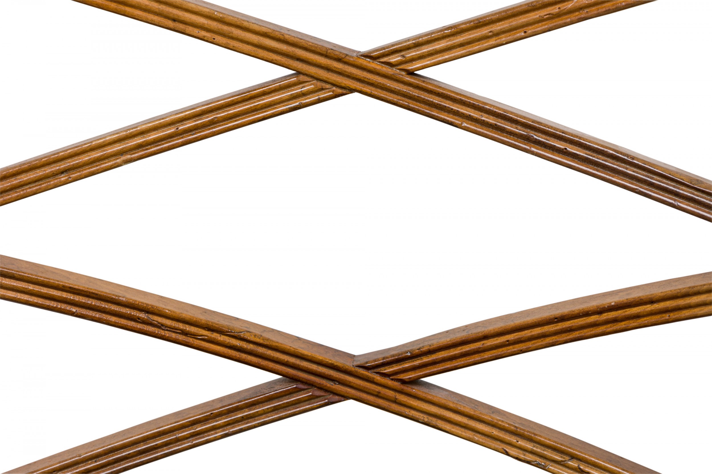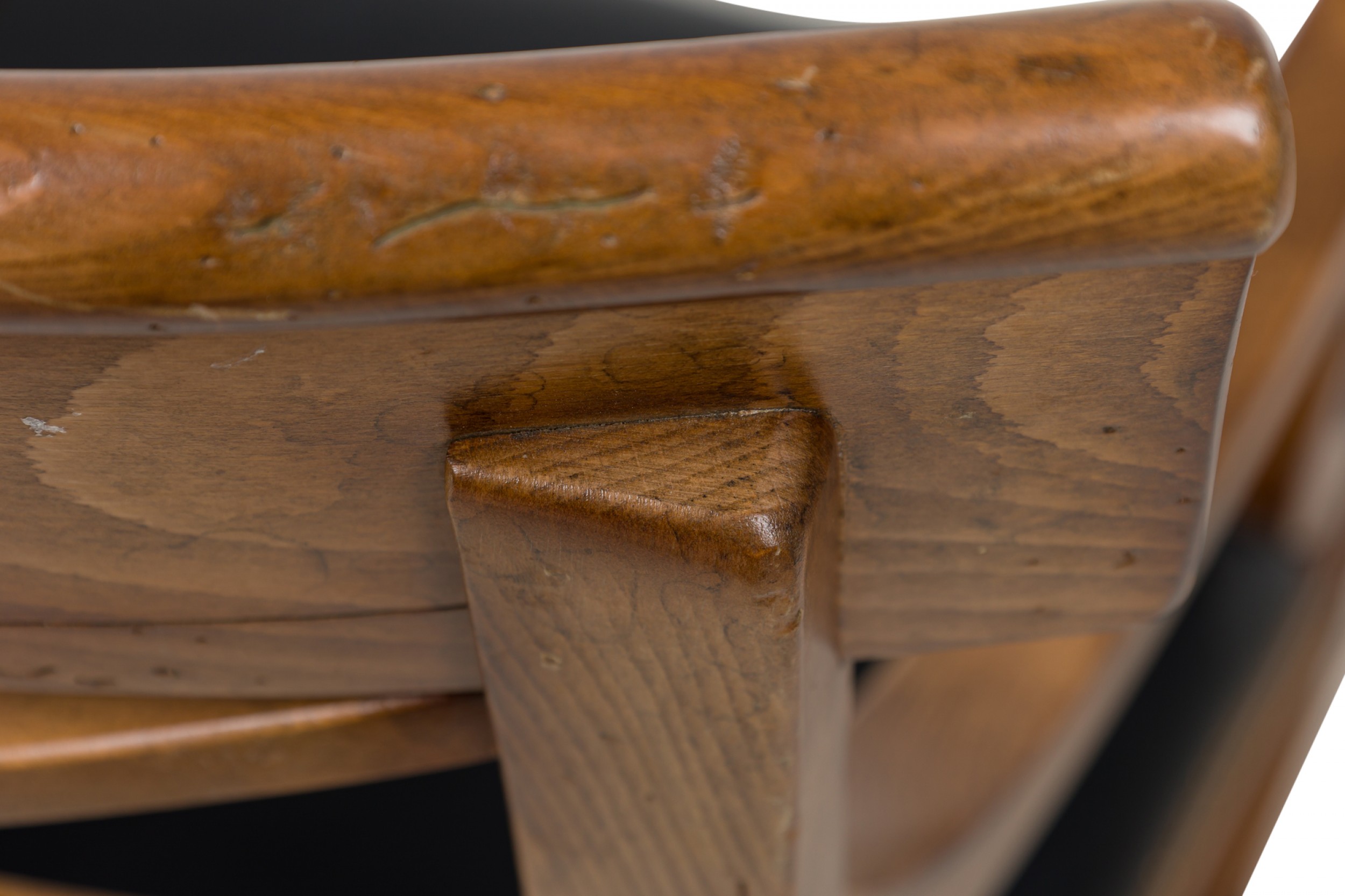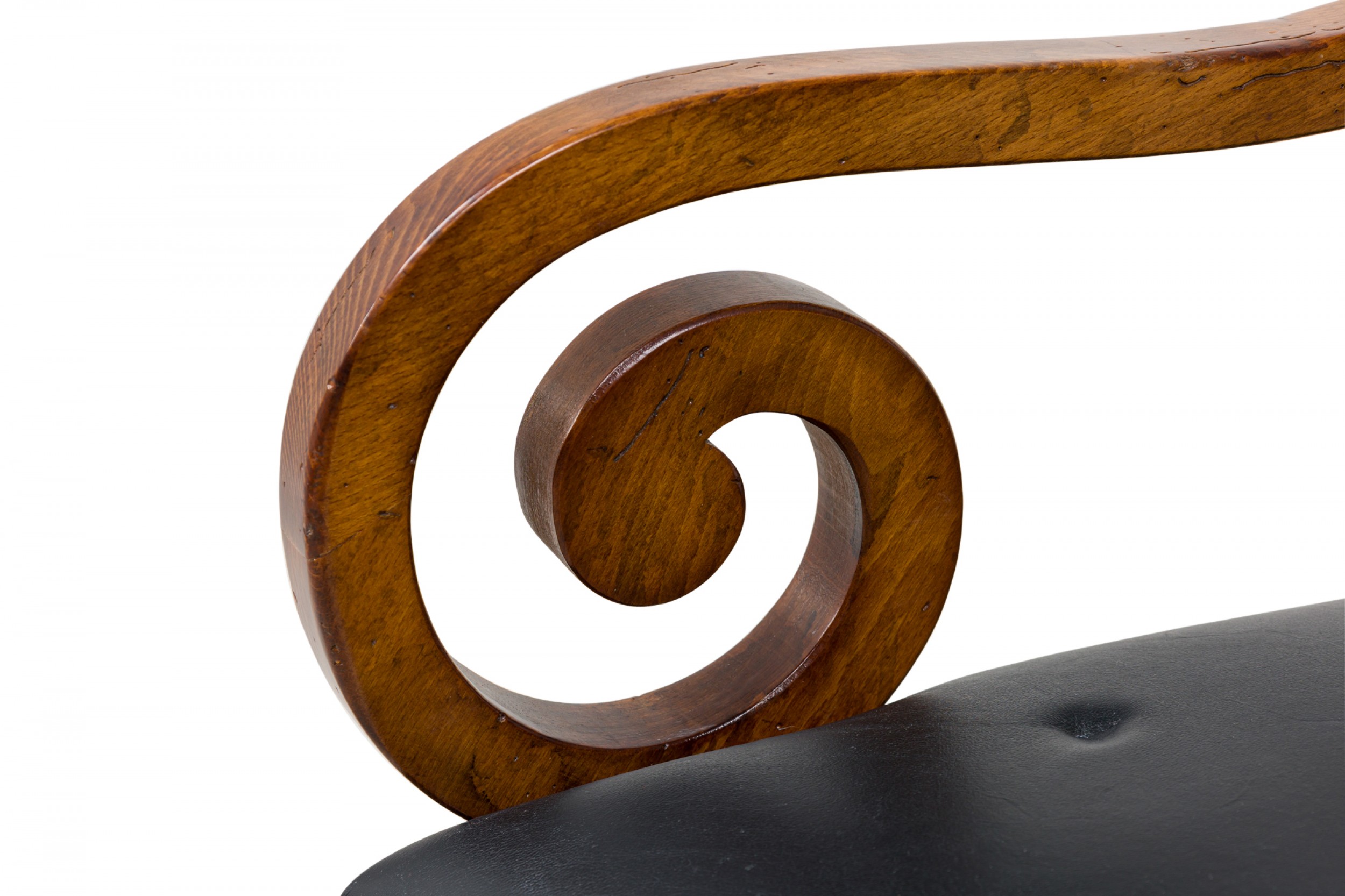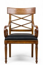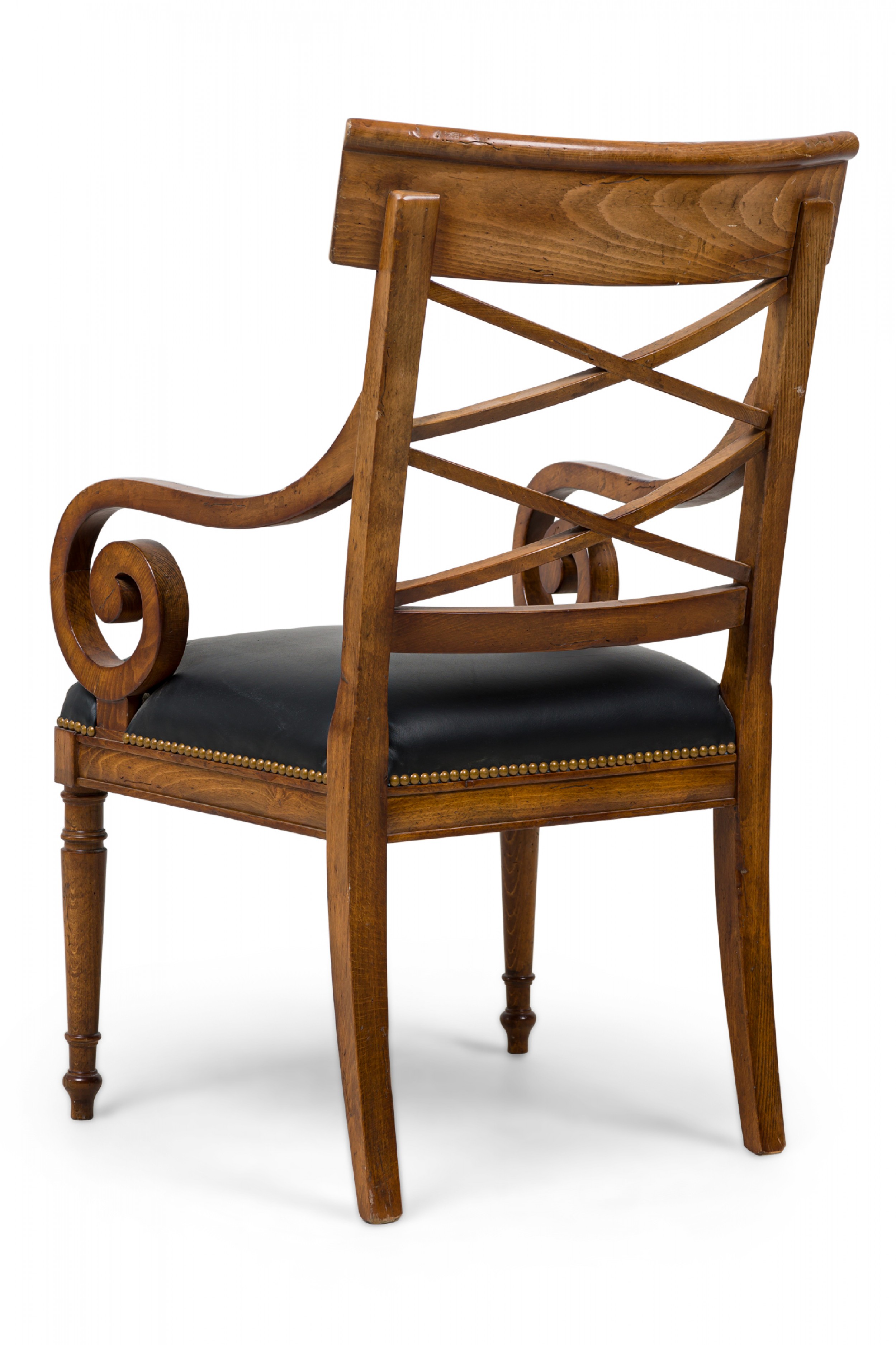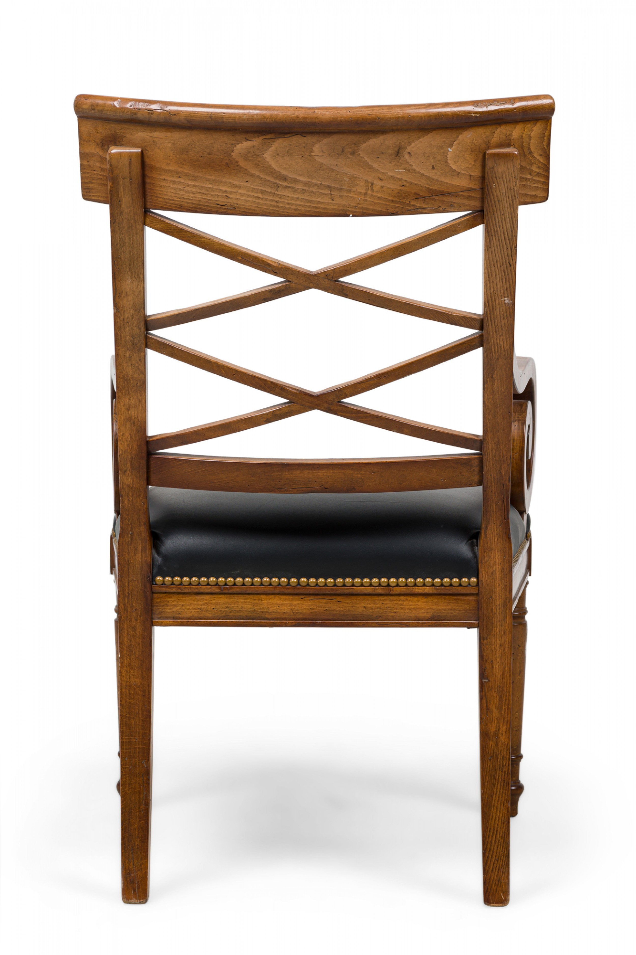 SET of 4 Italian Neo-classic-style (19th Century) armchairs with curved upper backrests followed by 2 fluted X-stretchers, and scroll arms, with padded seats upholstered in black leather tightly bordered by brass nailhead trim, standing on 2 turned front legs and slightly splayed back legs. (PRICED AS SET).