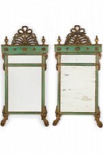PAIR of Italian Neo-classic (18/19th Century) wall mirrors with green painted and gilt accents, headed by pierce carved arch pediments topped with carved bow knots, urns and applied floral medallions, flanked by leaf and scroll embellishments, ending in two hoof-like gilt feet. (PRICED AS PAIR).