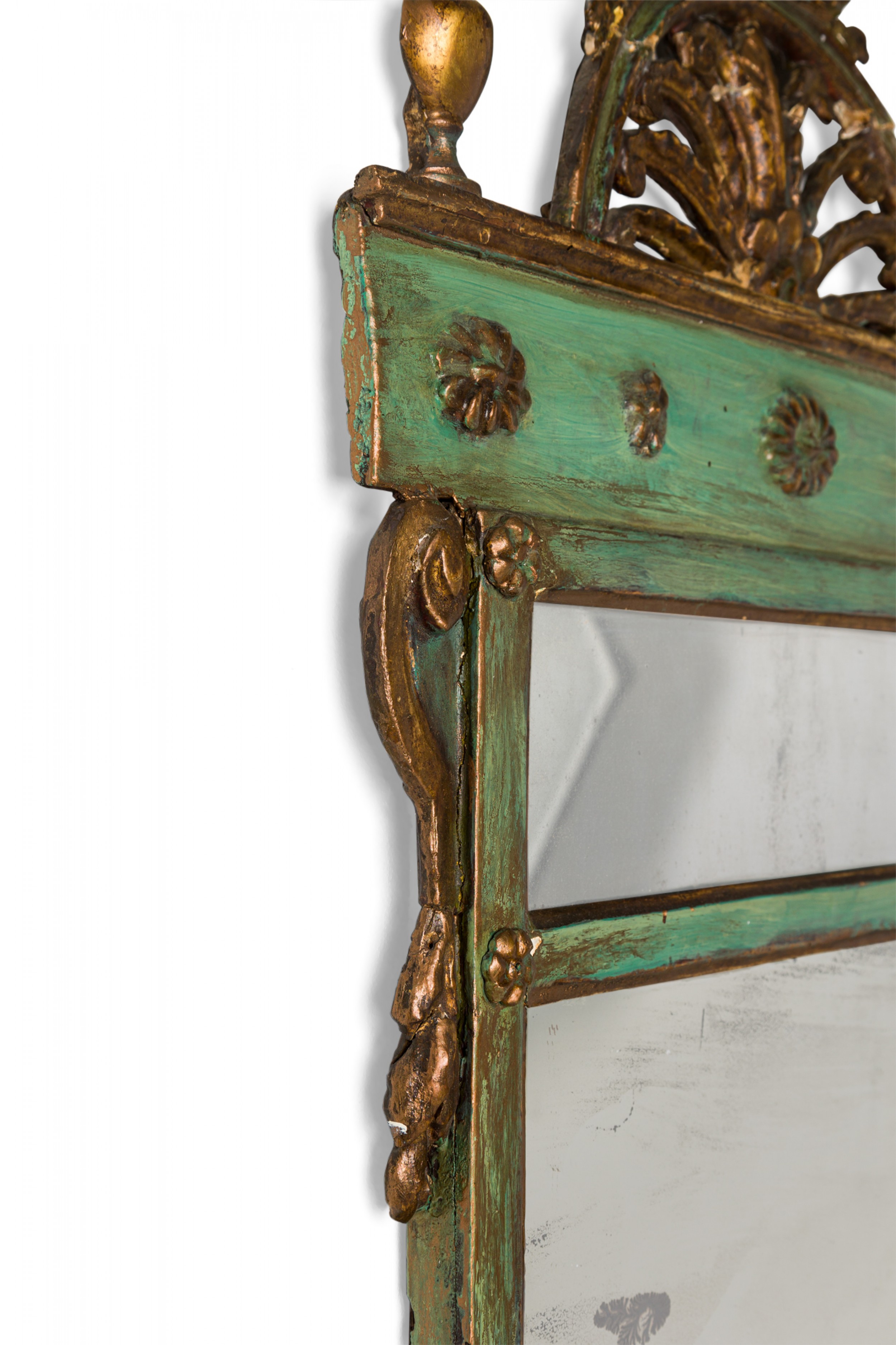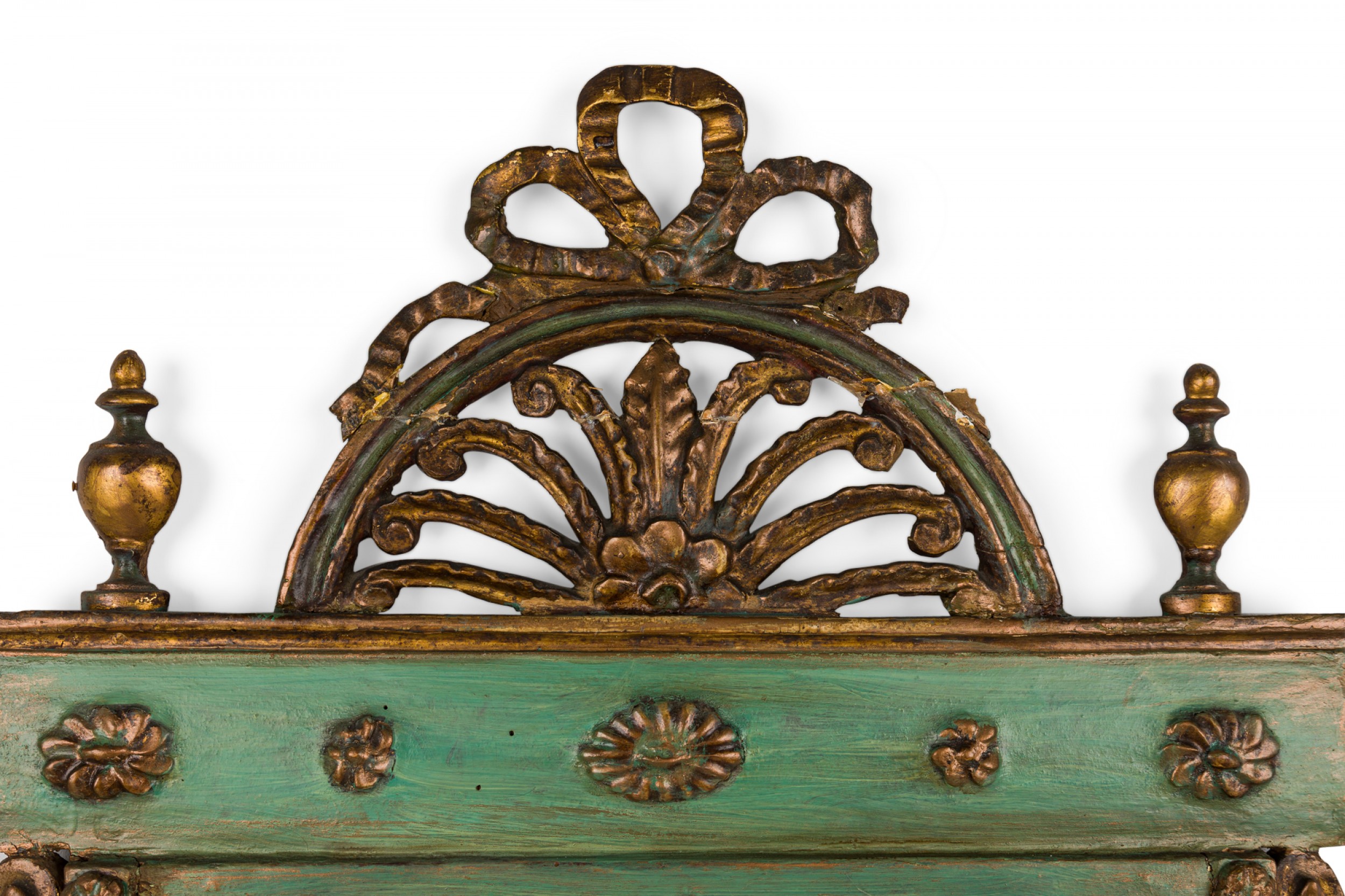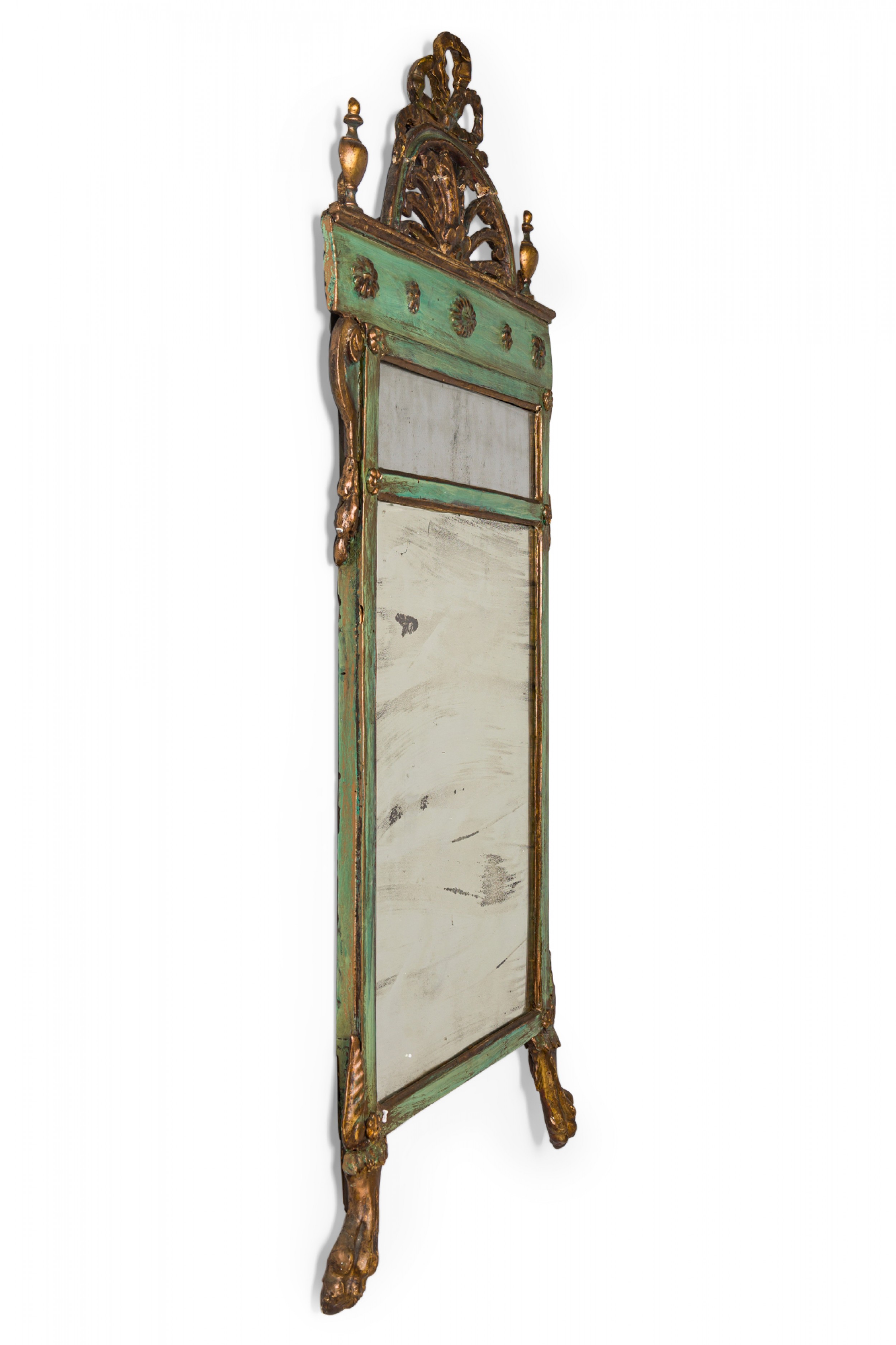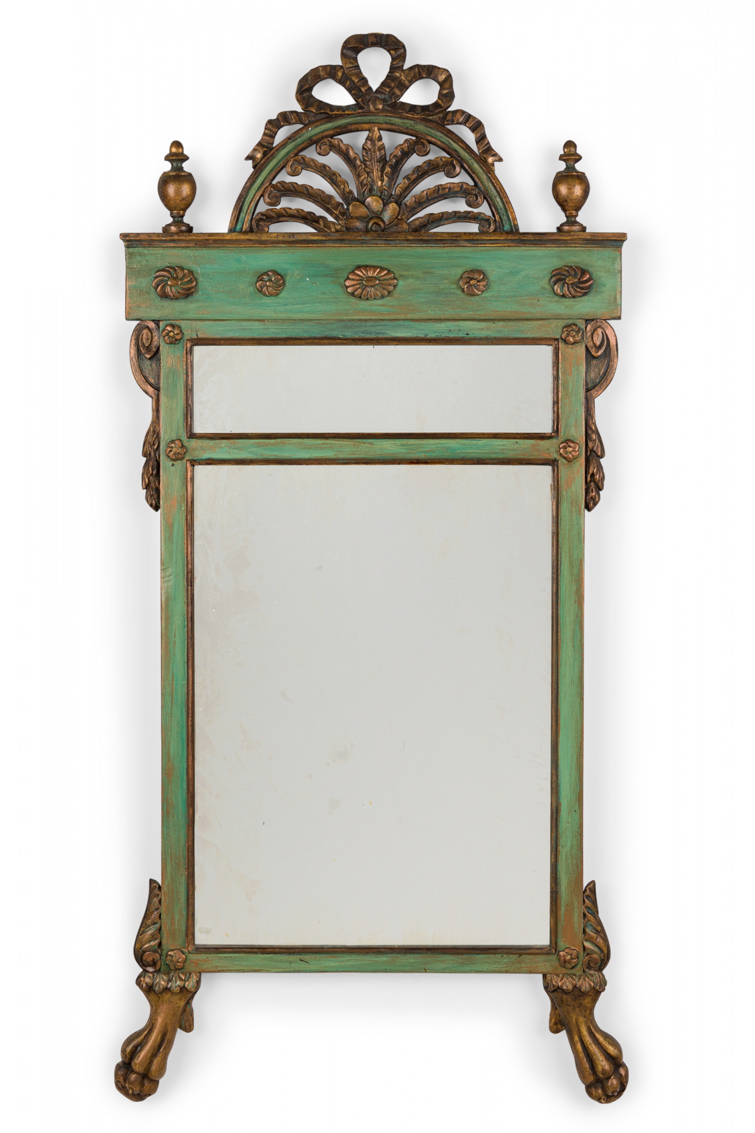 PAIR of Italian Neo-classic (18/19th Century) wall mirrors with green painted and gilt accents, headed by pierce carved arch pediments topped with carved bow knots, urns and applied floral medallions, flanked by leaf and scroll embellishments, ending in two hoof-like gilt feet. (PRICED AS PAIR)