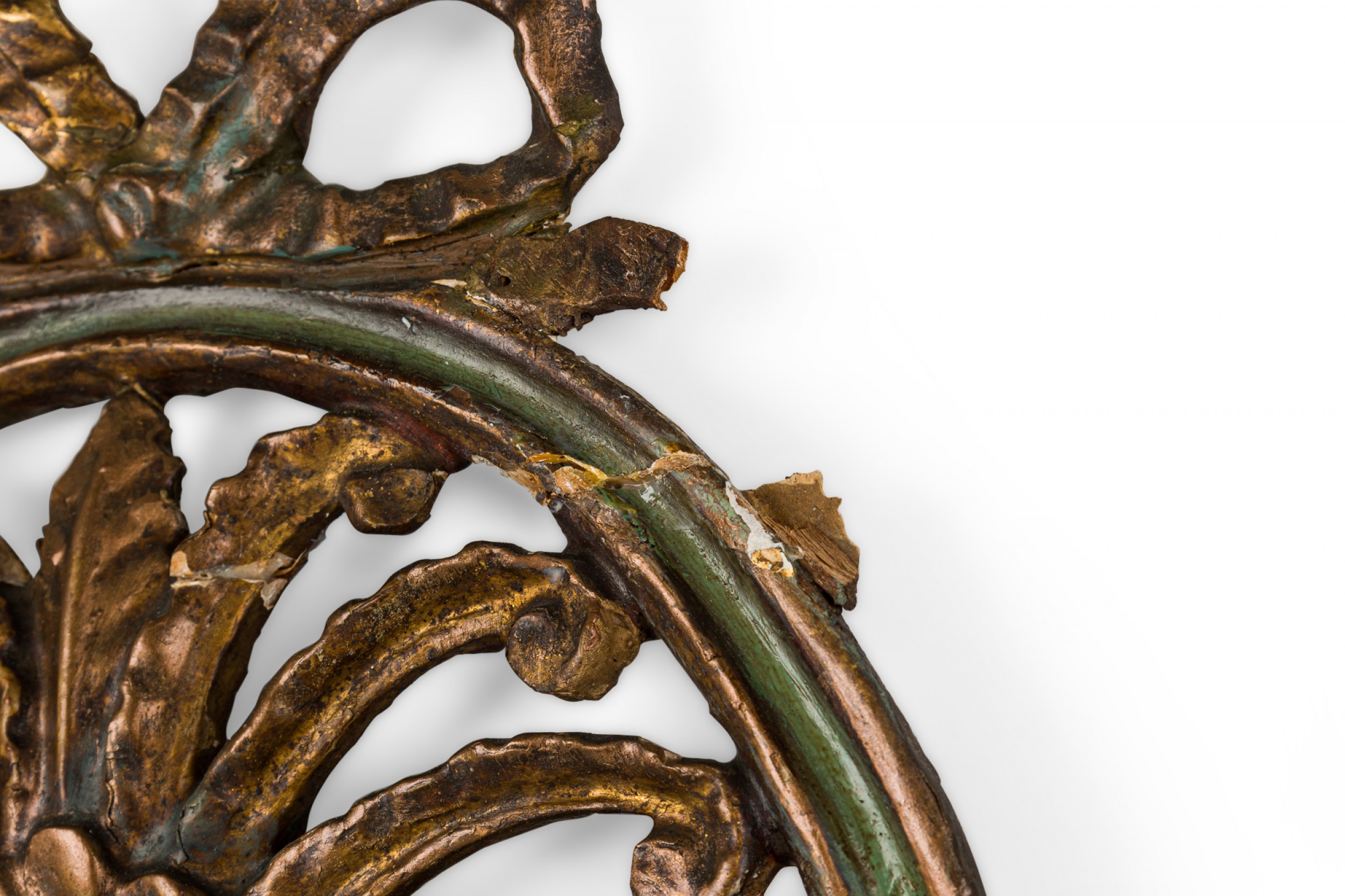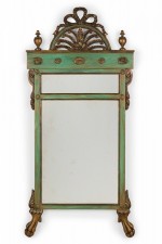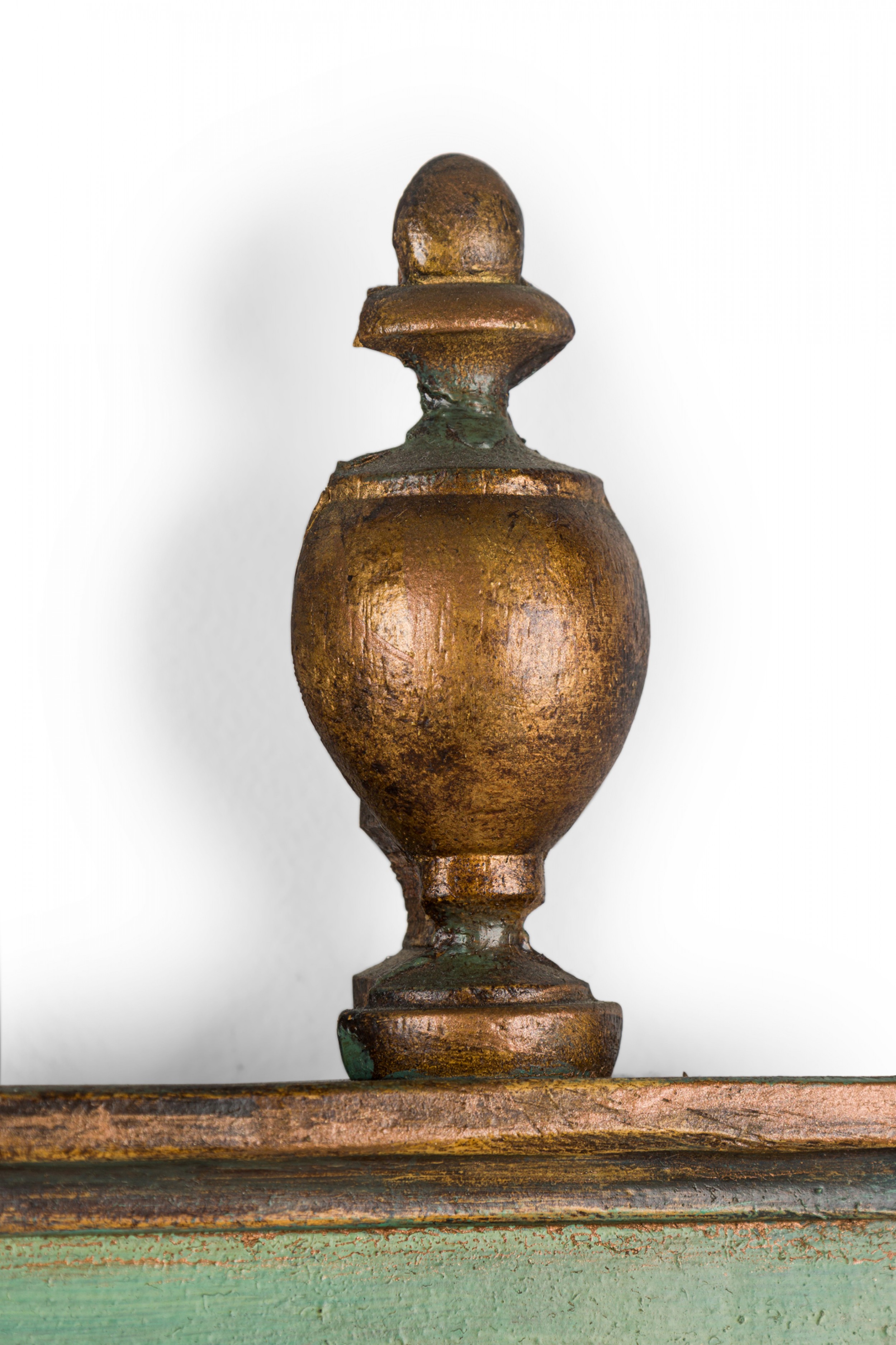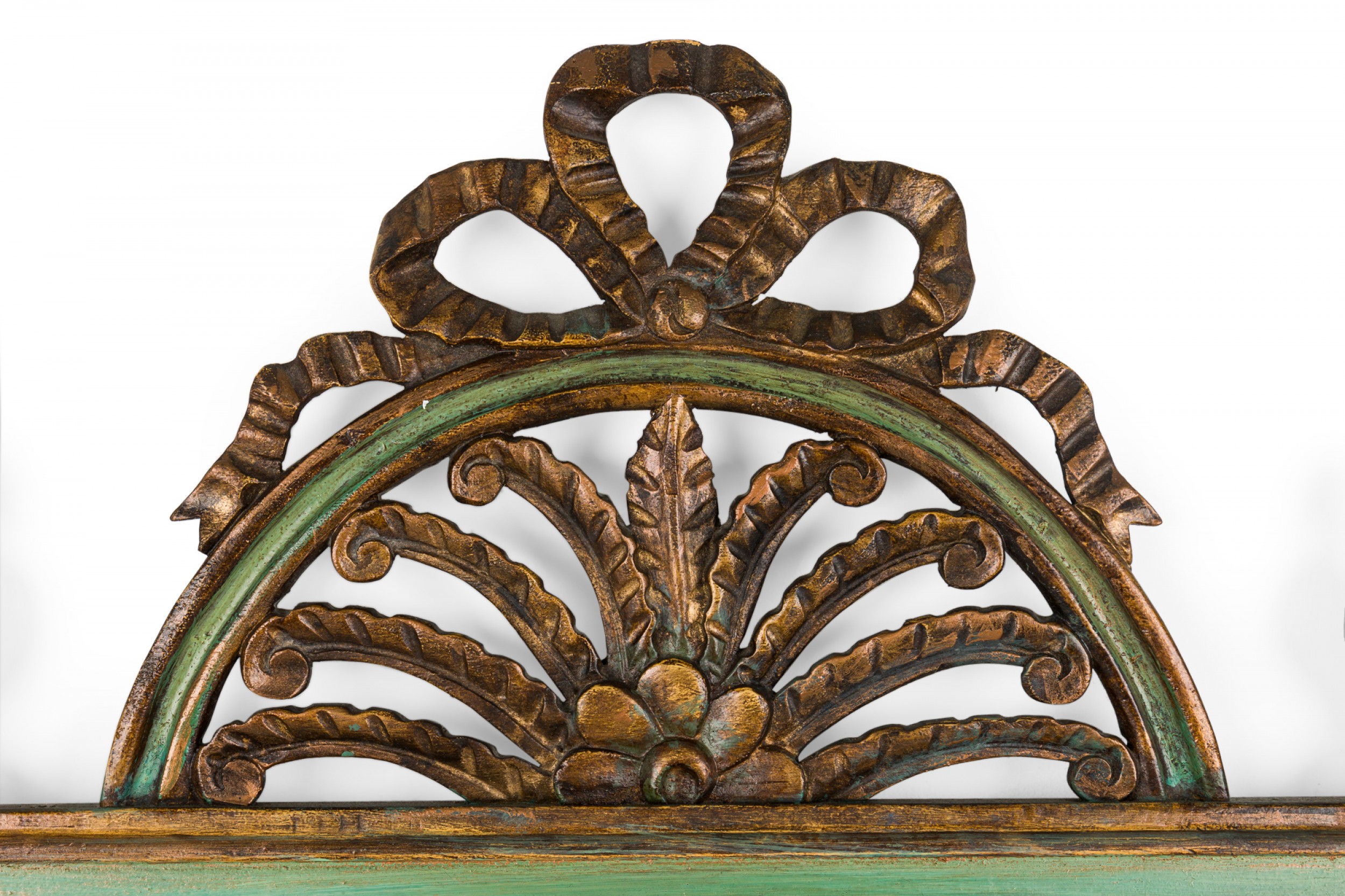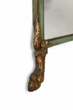 PAIR of Italian Neo-classic (18/19th Century) wall mirrors with green painted and gilt accents, headed by pierce carved arch pediments topped with carved bow knots, urns and applied floral medallions, flanked by leaf and scroll embellishments, ending in two hoof-like gilt feet. (PRICED AS PAIR)