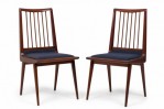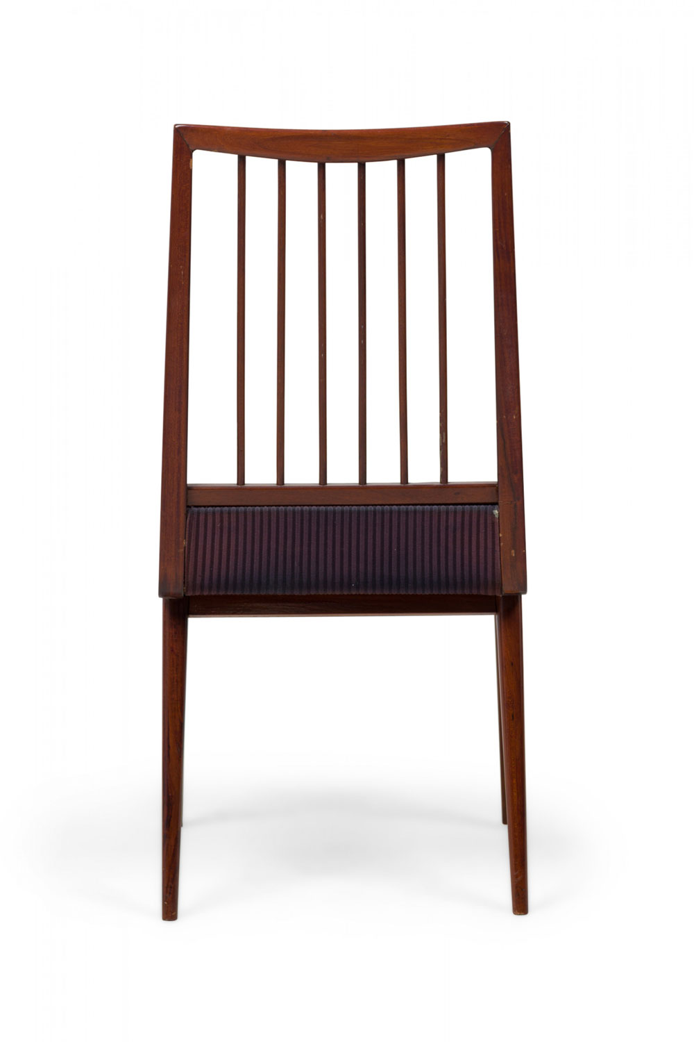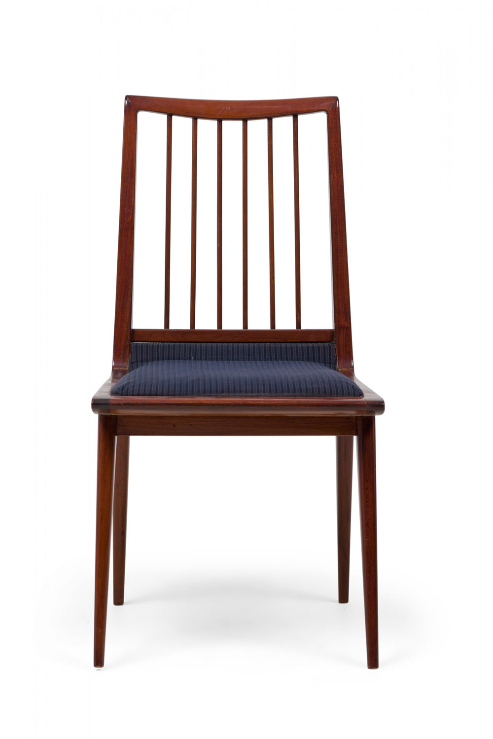 PAIR of Mid-Century (possibly Swedish) side chairs with shaped square backs having 6 evenly spaced vertical supports, tapered seats upholstered in a two-tone blue striped fabric, which extend to a horizontal stretcher, standing on 4 splayed legs. (PRICED AS PAIR)