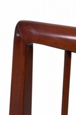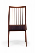 PAIR of Mid-Century (possibly Swedish) side chairs with shaped square backs having 6 evenly spaced vertical supports, tapered seats upholstered in a two-tone blue striped fabric, which extend to a horizontal stretcher, standing on 4 splayed legs. (PRICED AS PAIR).