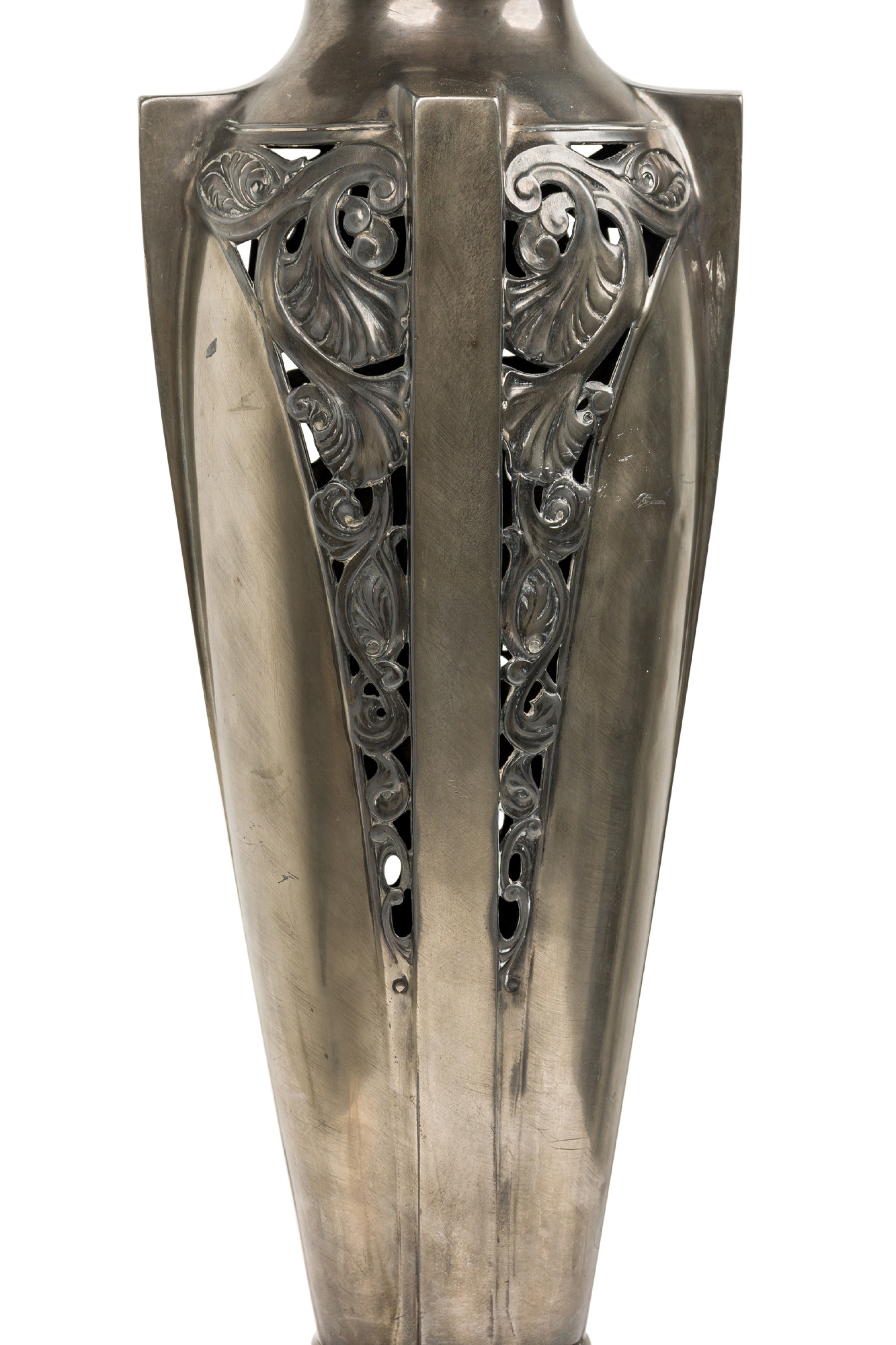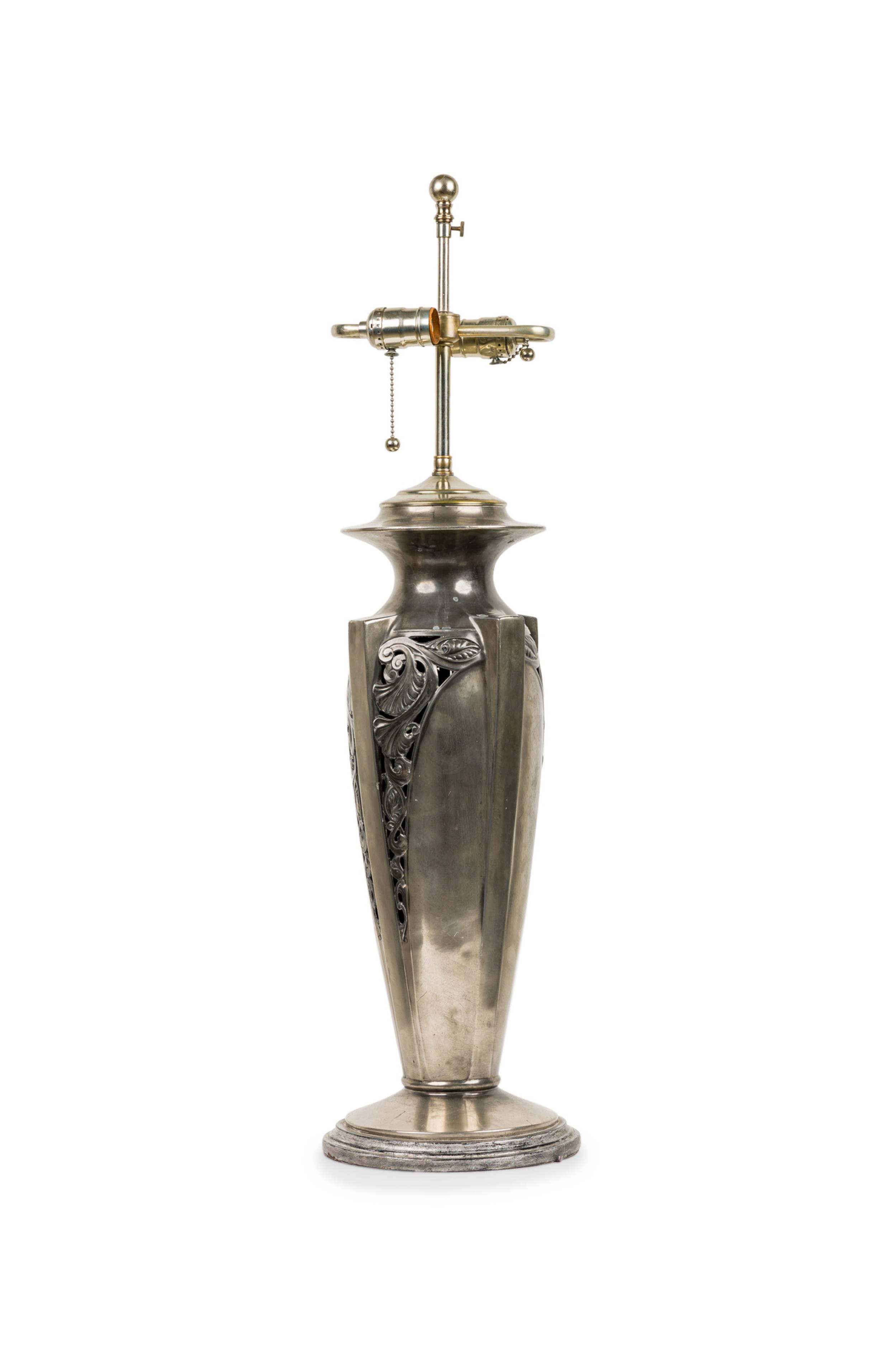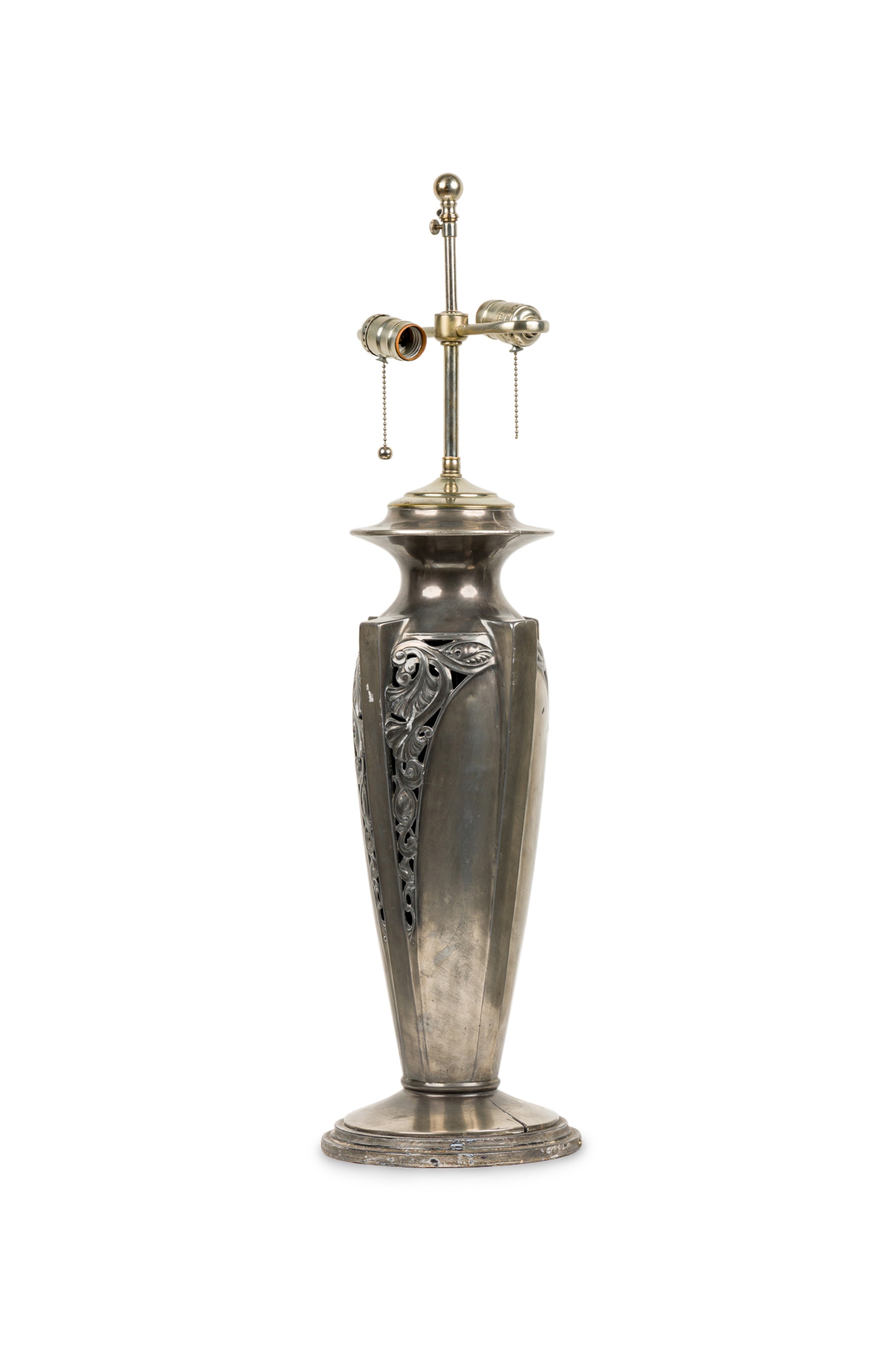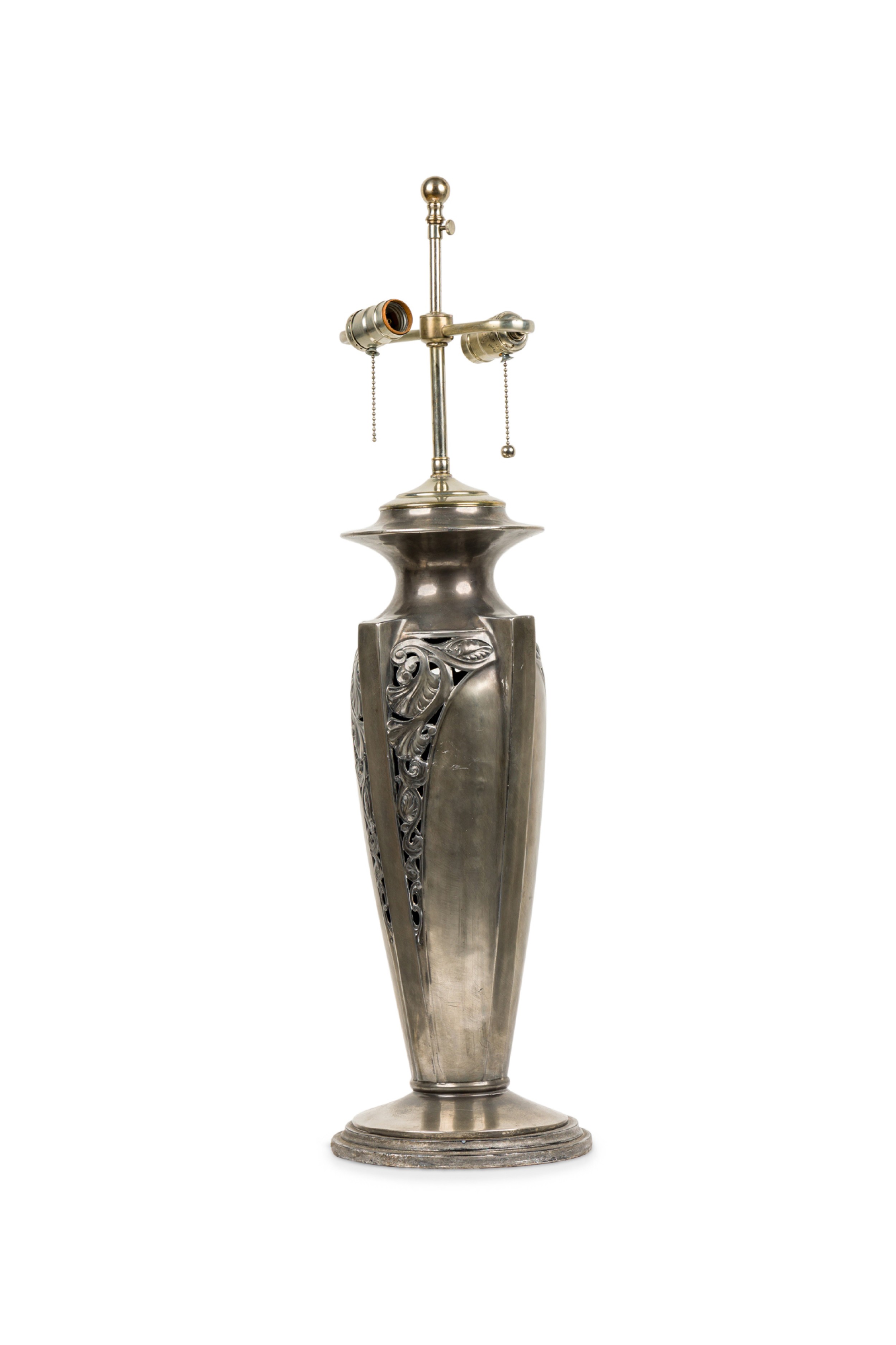 PAIR of American Art Deco silver plate table lamps with tall tapered vase form having a filigree floral design testing on t round stepped up base (PRICED AS PAIR)