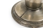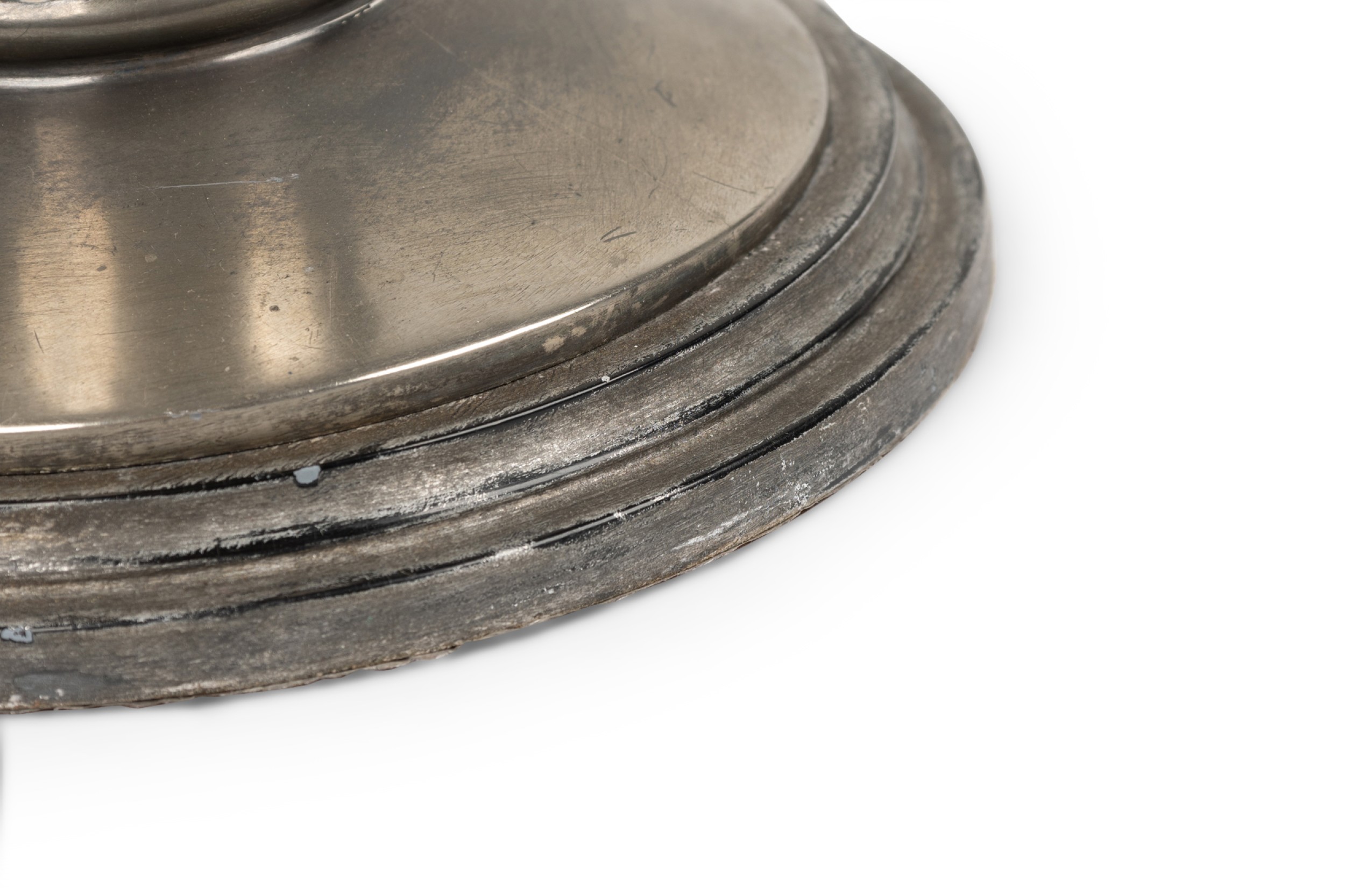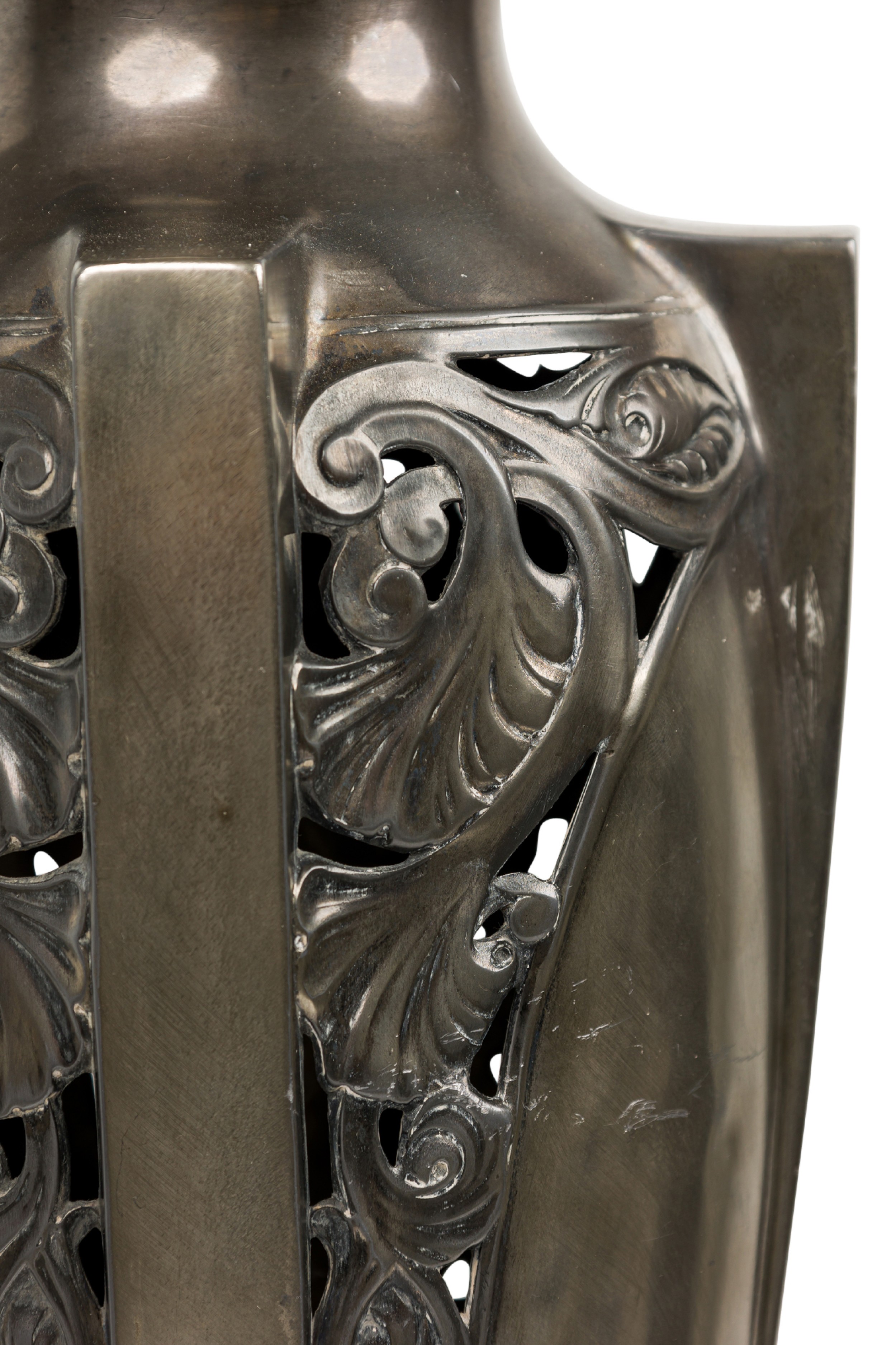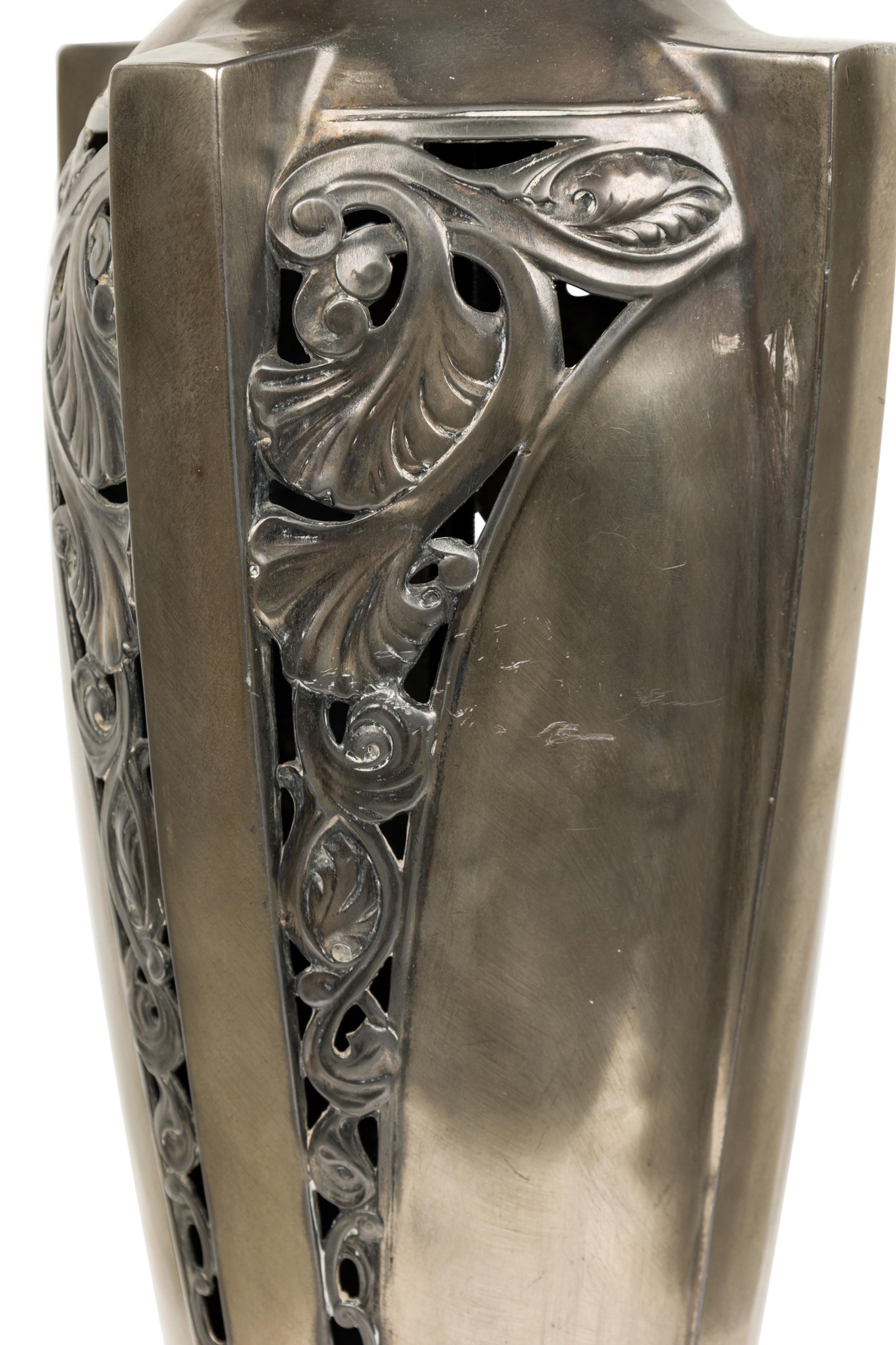 PAIR of American Art Deco silver plate table lamps with tall tapered vase form having a filigree floral design testing on t round stepped up base (PRICED AS PAIR)