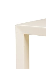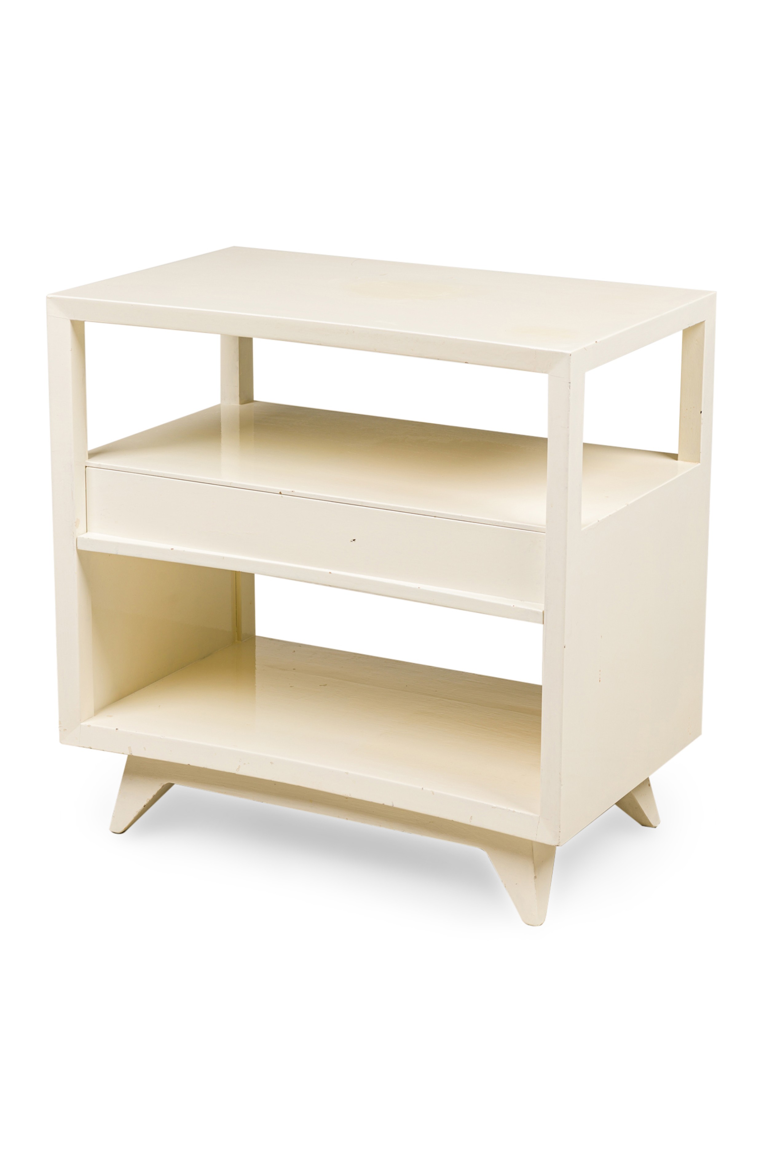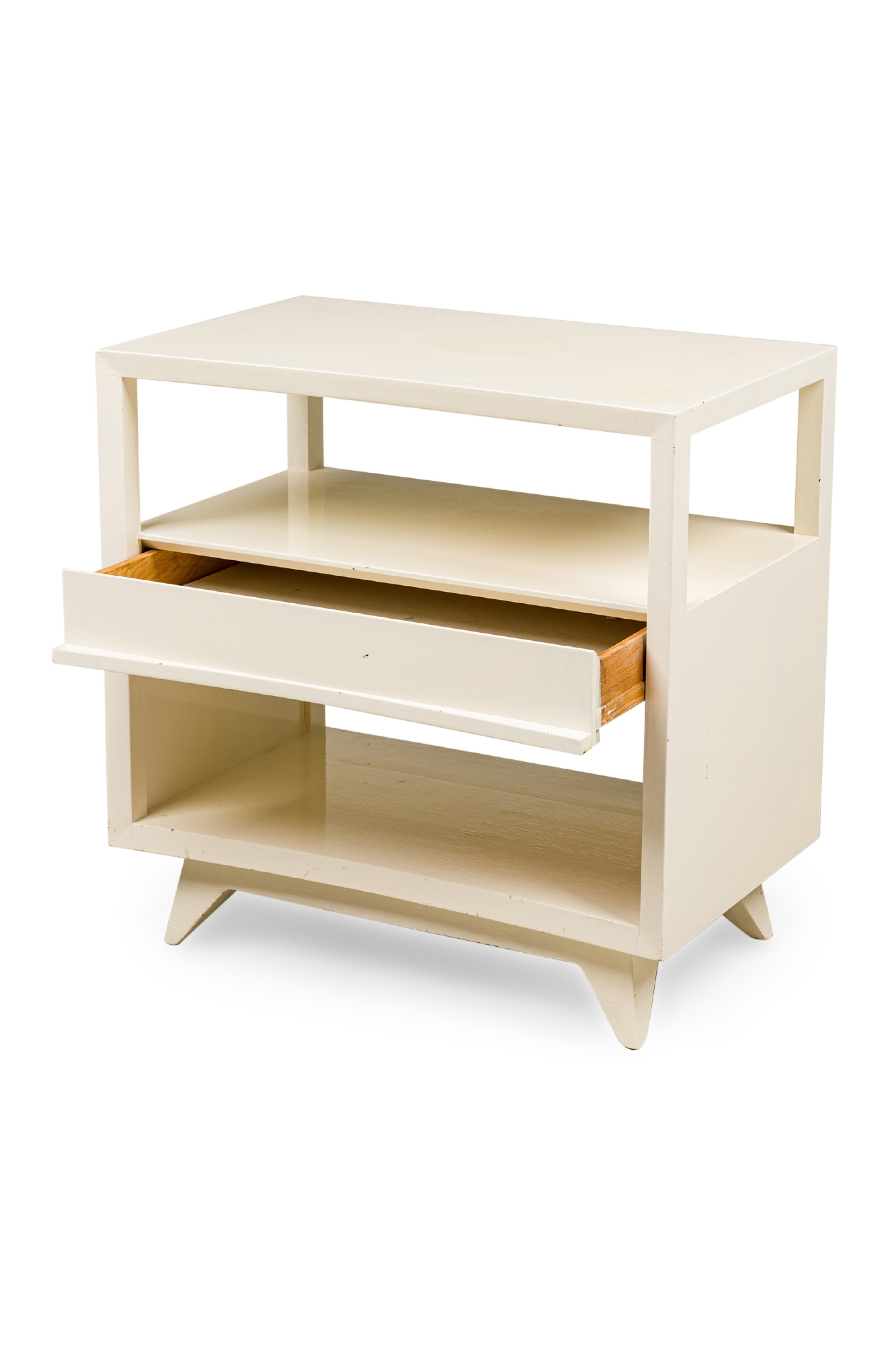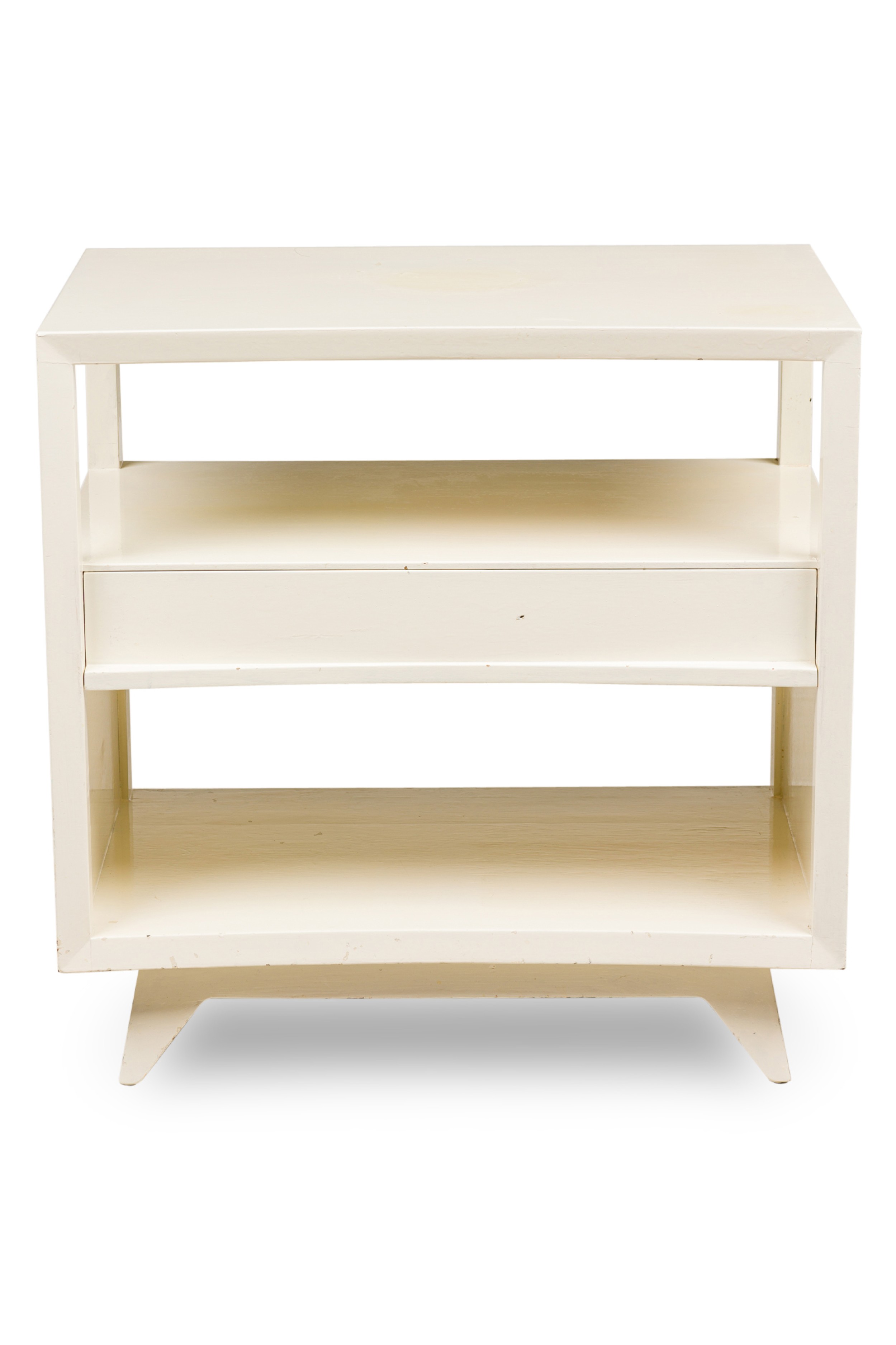 2 American Contemporary white two-tier end table with a concave top and a draw in the middle separating both tiers (PRICED AS PAIR.