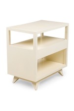 2 American Contemporary white two-tier end table with a concave top and a draw in the middle separating both tiers (PRICED AS PAIR