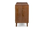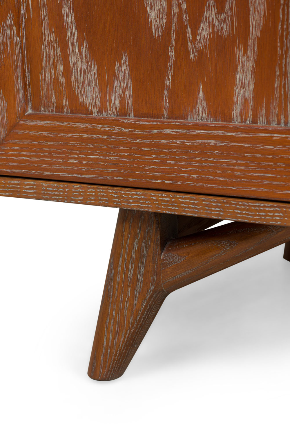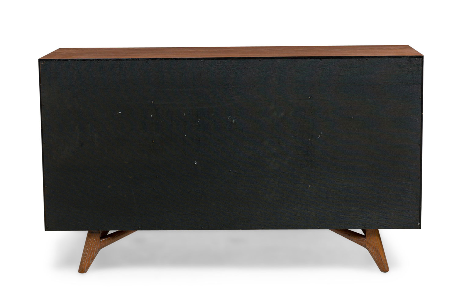 American Mid-Century dark stained cerused oak dresser with 2 doors centering four drawers (2 small above two large) and resting on low slanted legs (IDENTICAL CHEST IN FLORIDA: REG4036A)