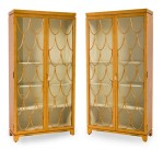 PAIR of American Mid-Century blond wood bookcase / display cabinet with 2 front glass doors have a gold painted arched pattern on each door, with a off white painted interior (THEODORE ALEXANDER) (PRICED AS PAIR).