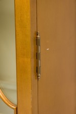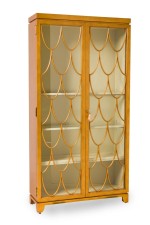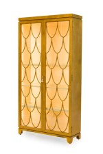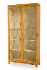 PAIR of American Mid-Century blond wood bookcase / display cabinet with 2 front glass doors have a gold painted arched pattern on each door, with a off white painted interior (THEODORE ALEXANDER) (PRICED AS PAIR)