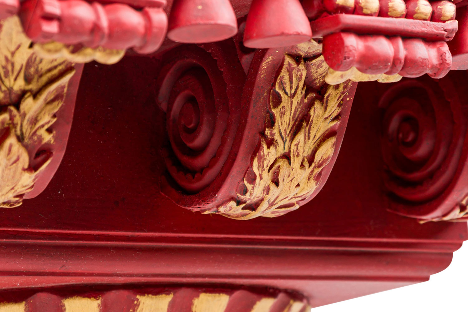 PAIR of American Mid-Century style red painted and gold trimmed carved wall shelf with a fluted design bottom (PRICED AS PAIR) AVAILABLE INDIVIDUALLY.