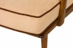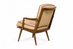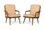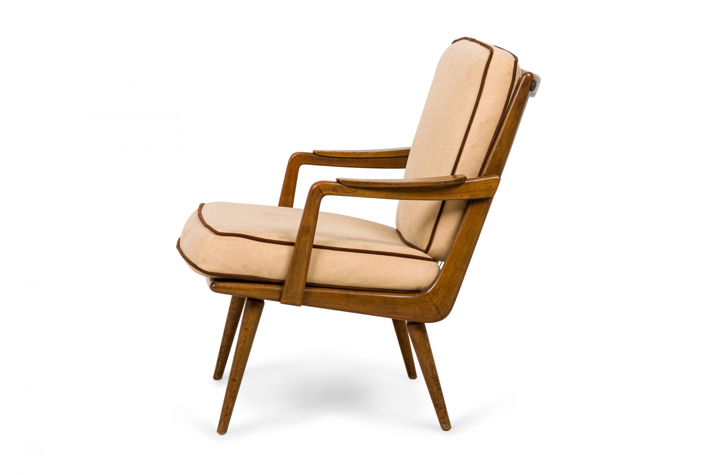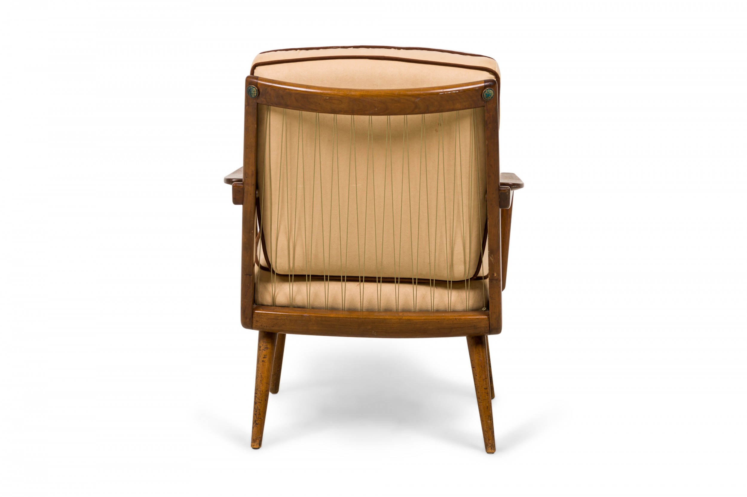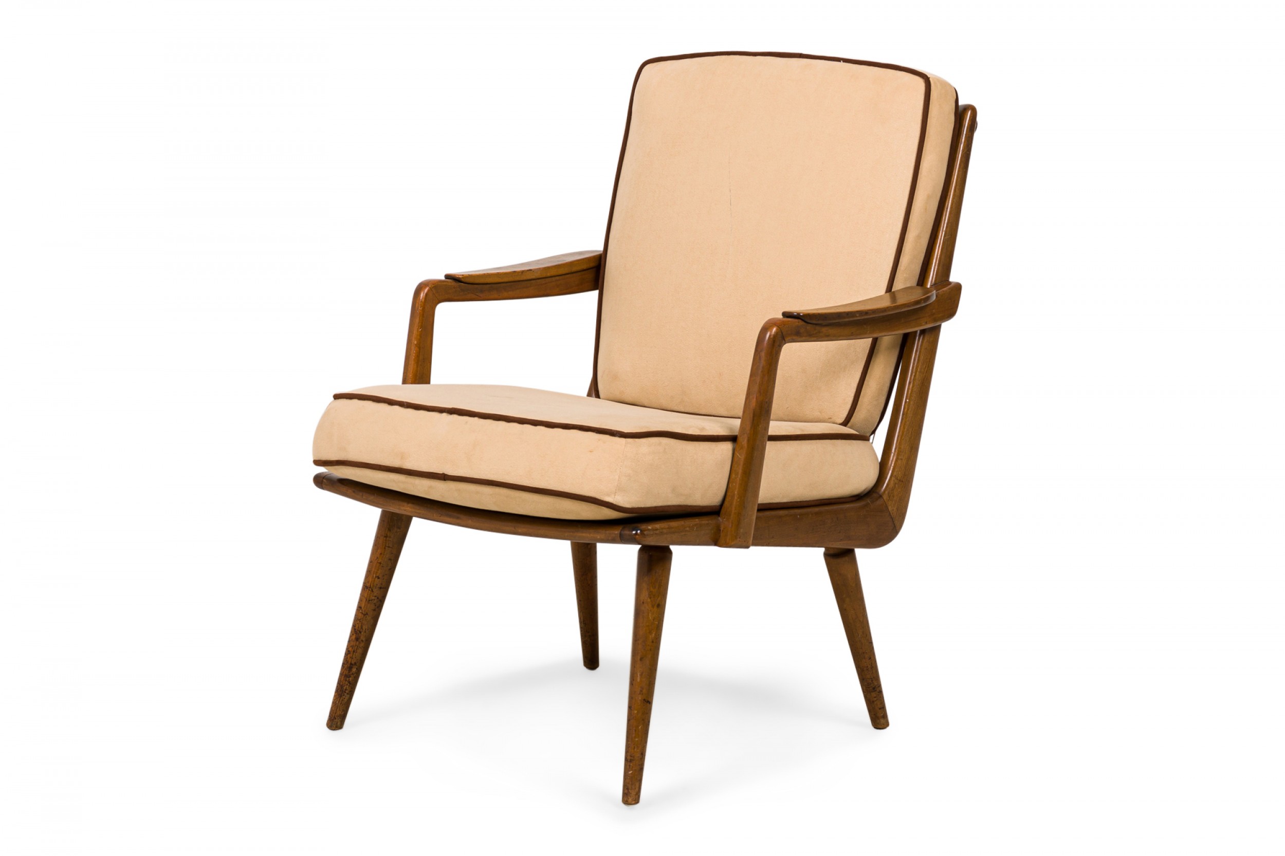 PAIR of American Mid-Century petite lounge / armchairs with shaped walnut frames and beige fabric upholstered seat cushions with black piping, resting on four angled and tapered round legs. (PRICED AS PAIR).