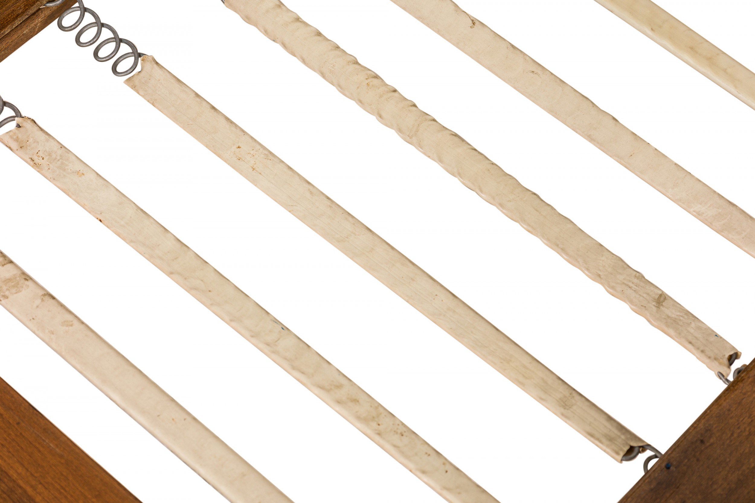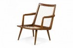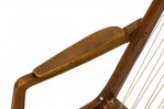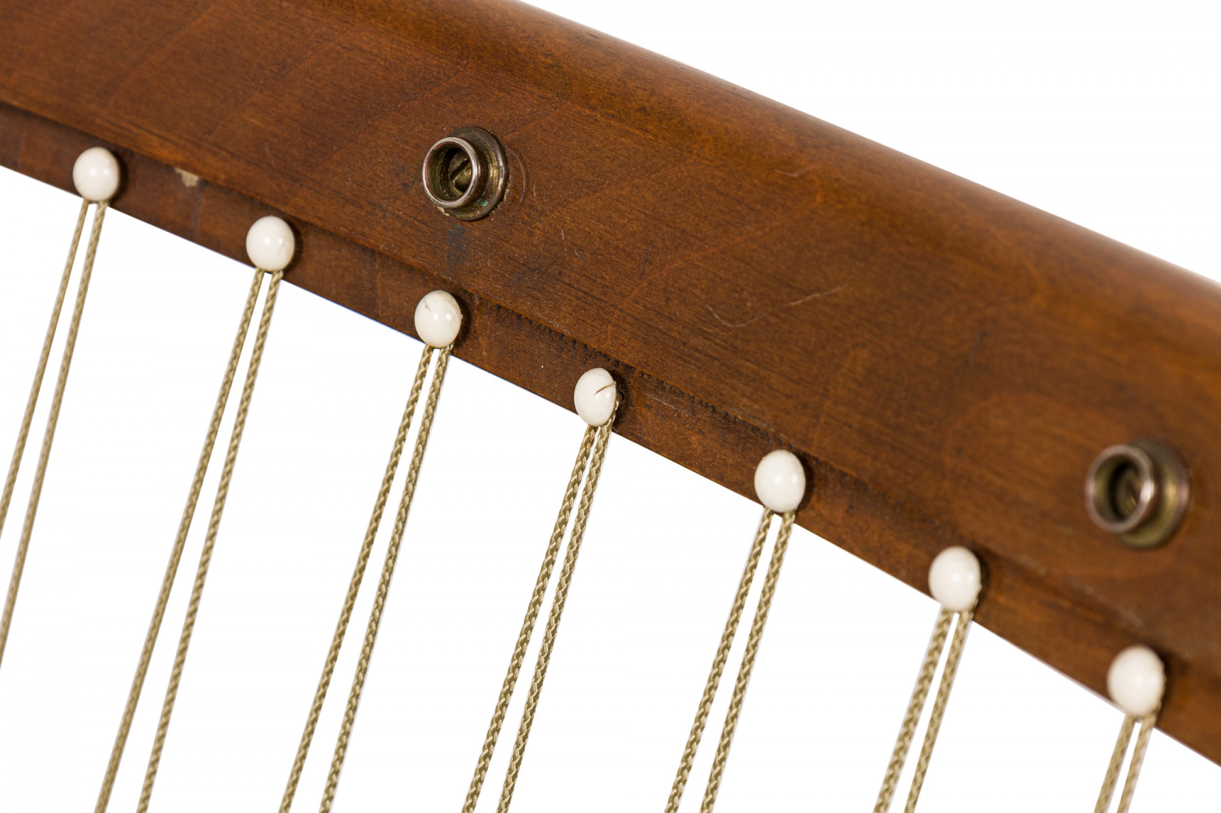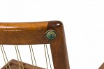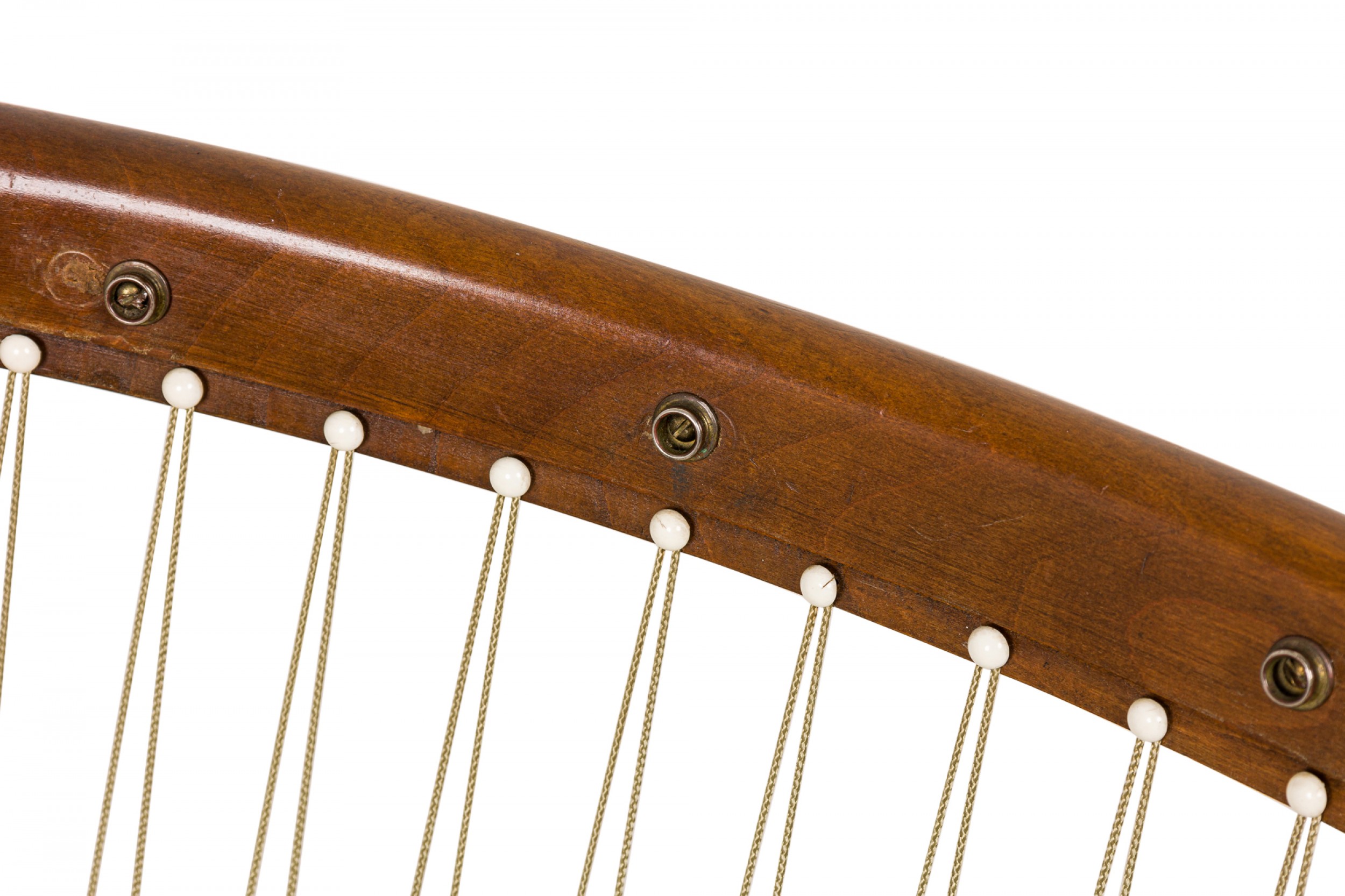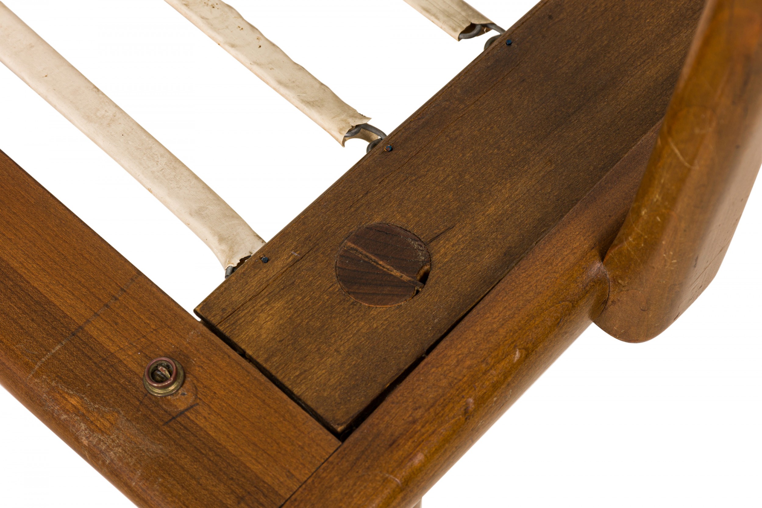 Style: Mid-Century Materials & Techniques: Fabric, upholstered, walnut, wood Category: Seating Condition: Water stain to corner of one seat, faint pen mark on center back of same chair. Good; Wear consistent with age and use