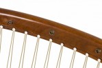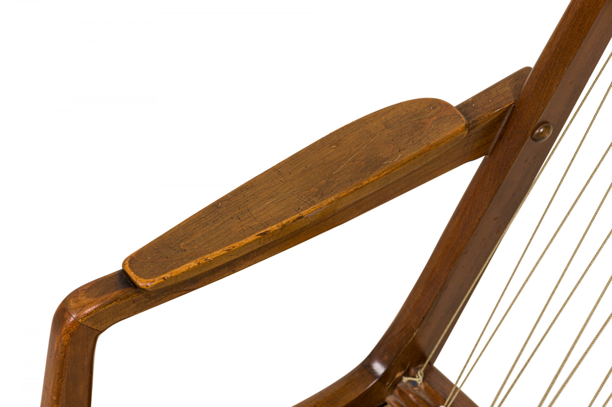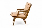 PAIR of American Mid-Century petite lounge / armchairs with shaped walnut frames and beige fabric upholstered seat cushions with black piping, resting on four angled and tapered round legs. (PRICED AS PAIR)
