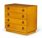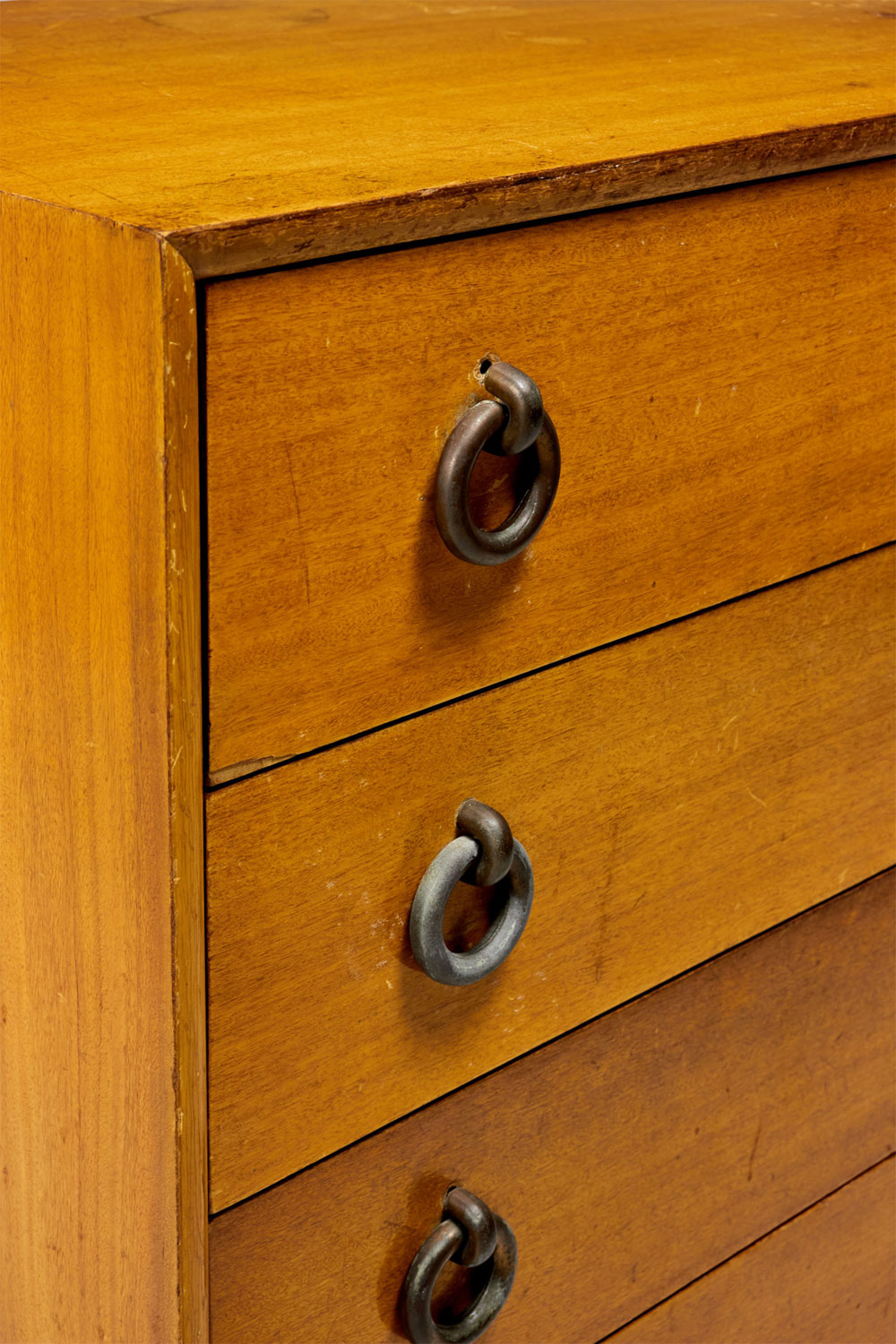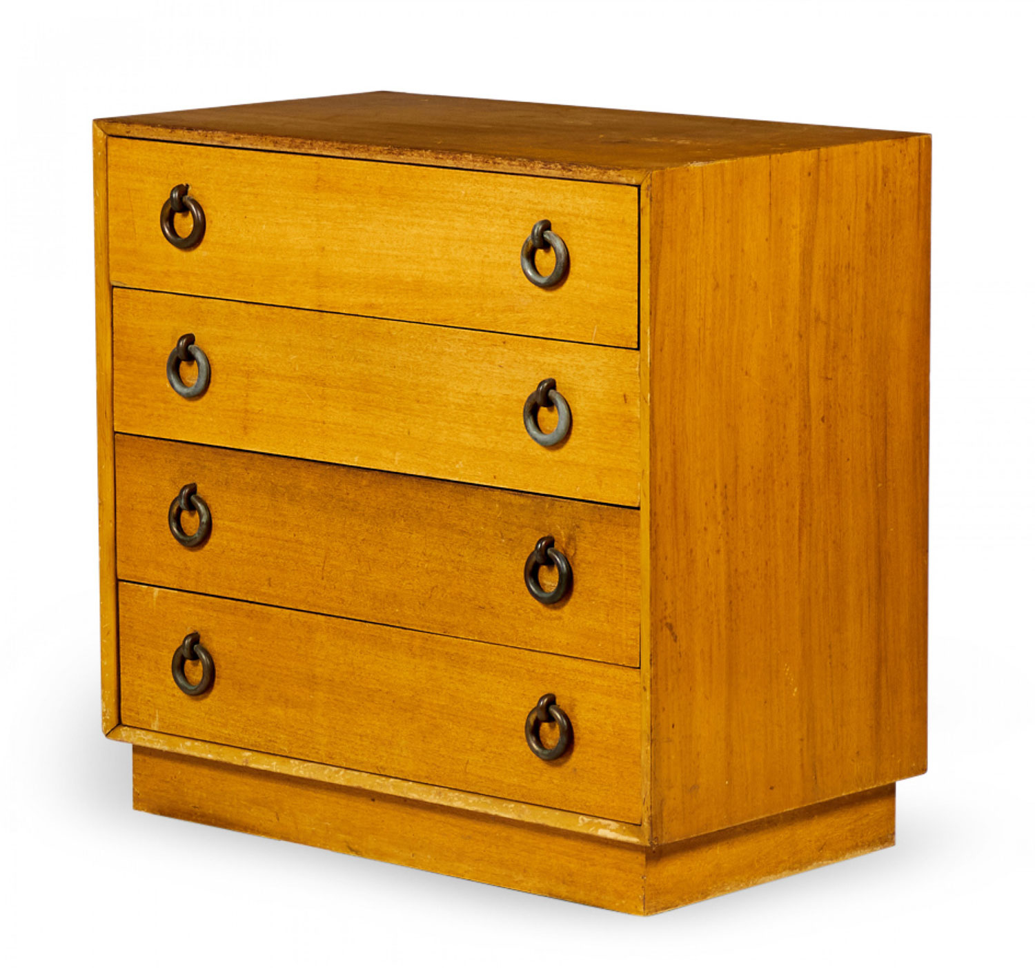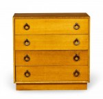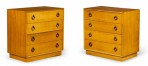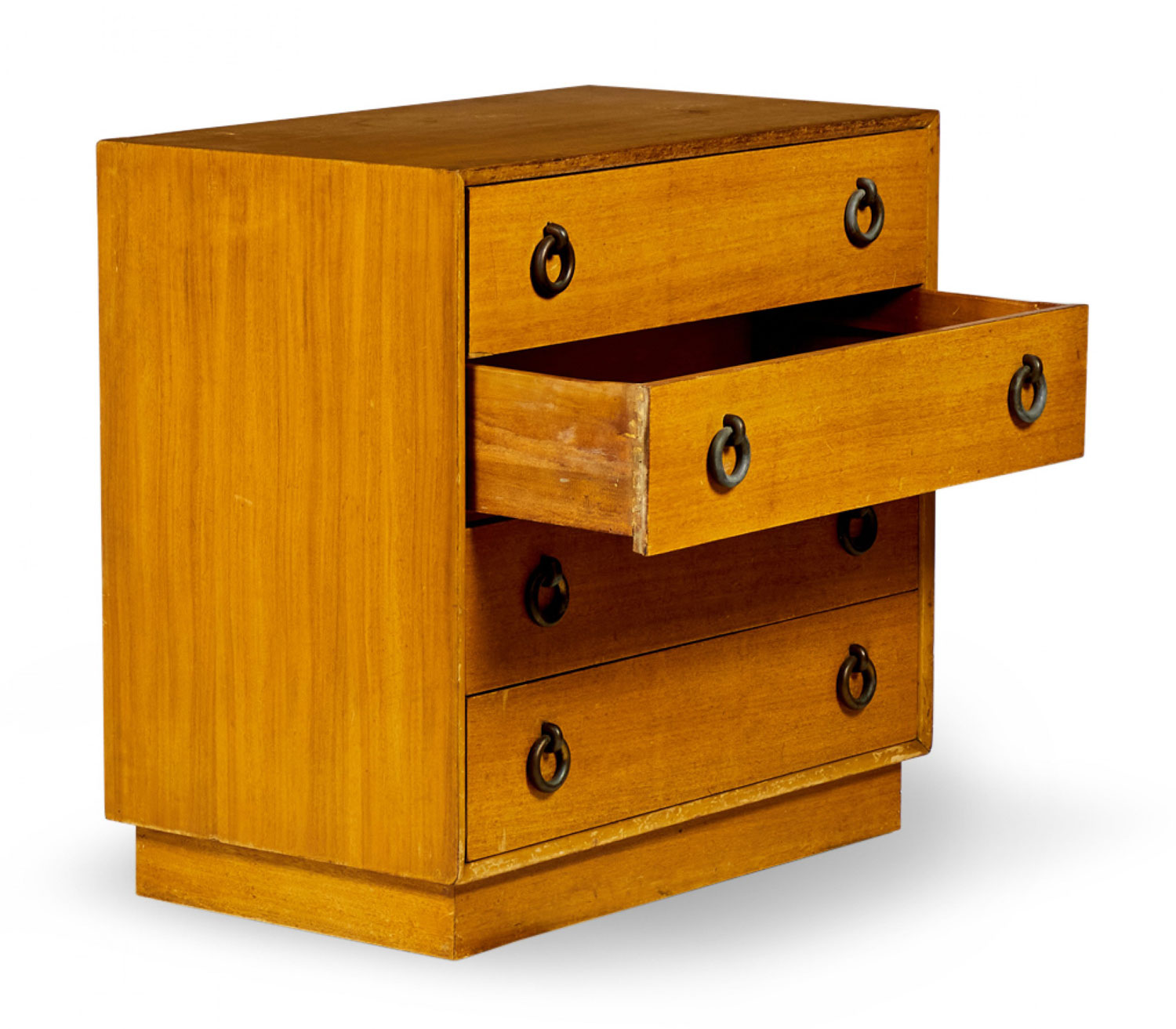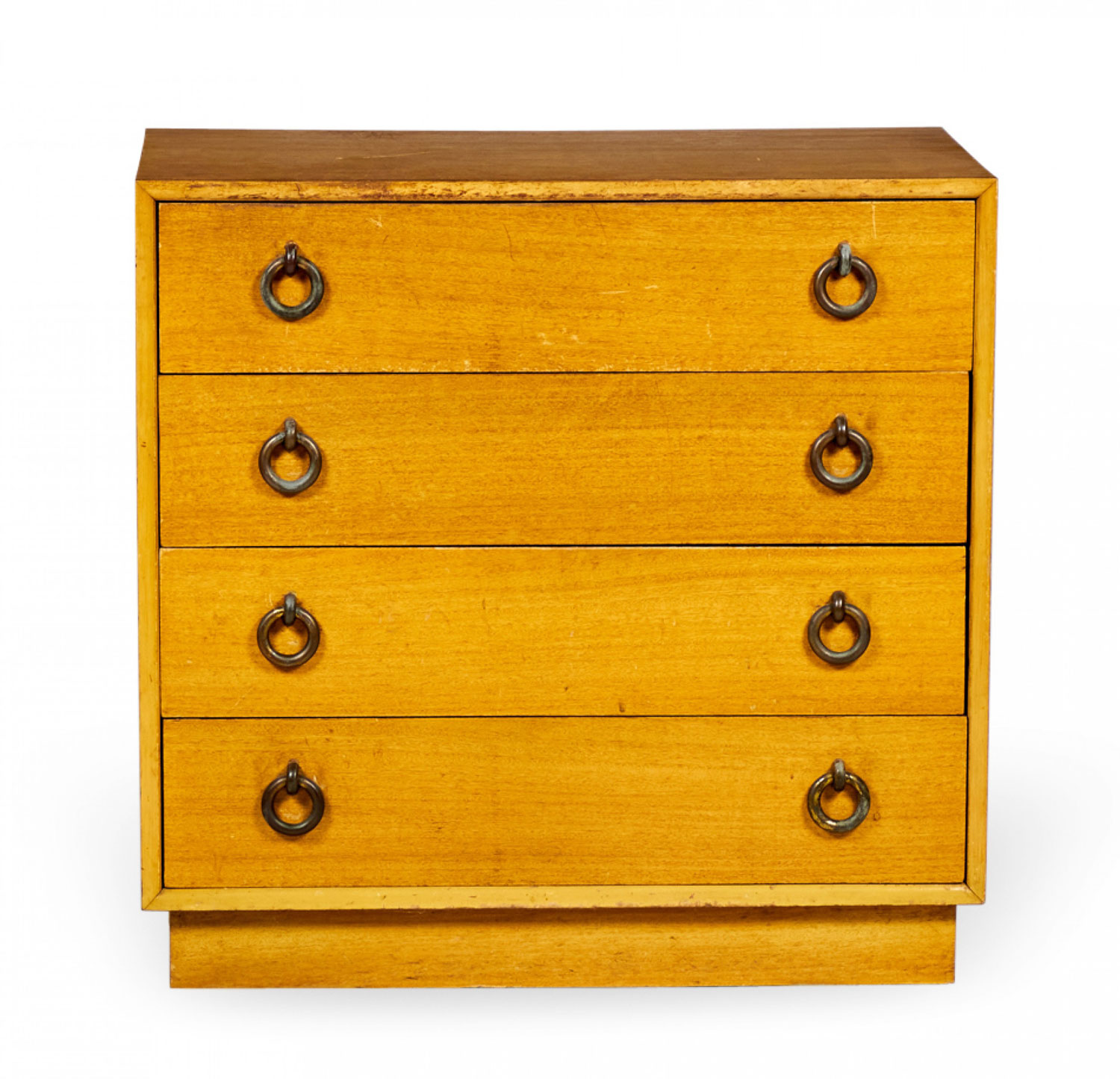 PAIR of American Mid-Century walnut chests with four drawers with two brass ring drawer pulls each.